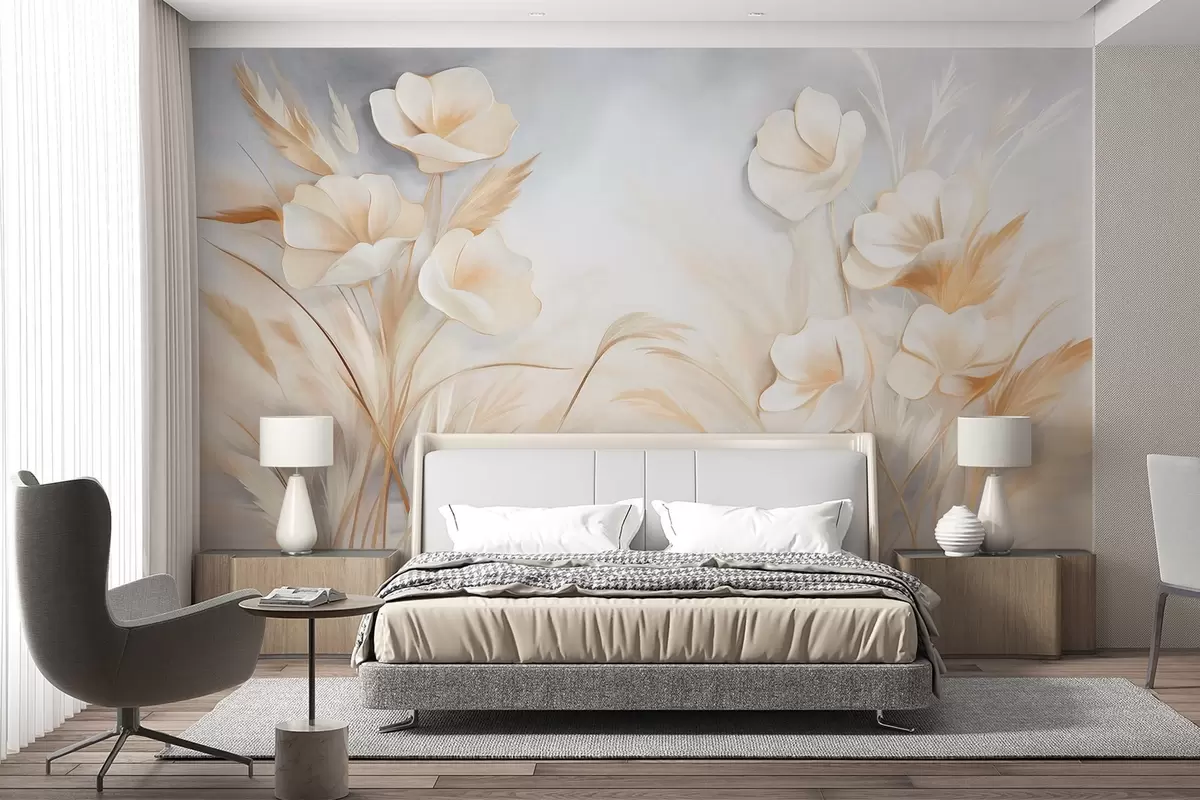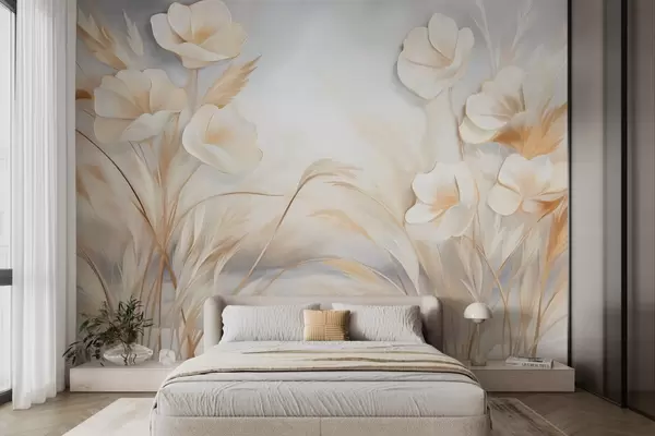 Fototapety Bílé květy, béžové rákosí a pampová tráva, texturované, elegantní, minimalistický styl, abstraktní pozadí krajiny Č. w09490