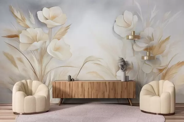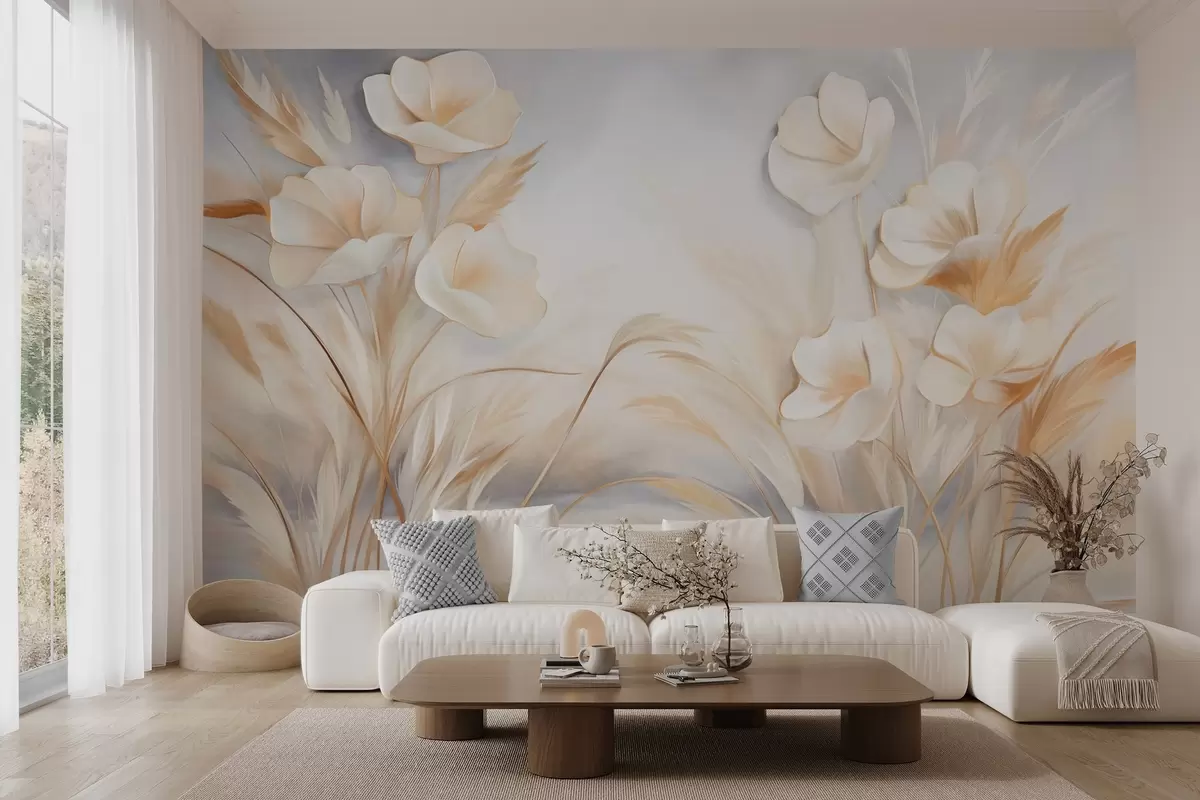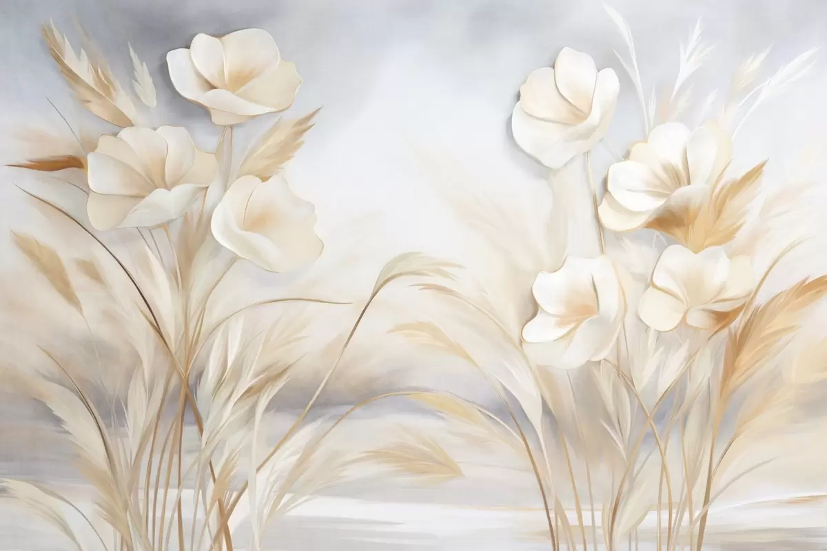 Fototapety Bílé květy, béžové rákosí a pampová tráva, texturované, elegantní, minimalistický styl, abstraktní pozadí krajiny Č. w09490
