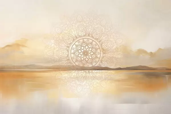 Fototapety Texturovaný symetrický mandalový vzor překrývající krajinu s mořem, kopci a oblohou, jemné pastelové barvy Č. w09491