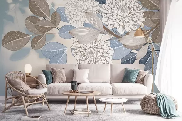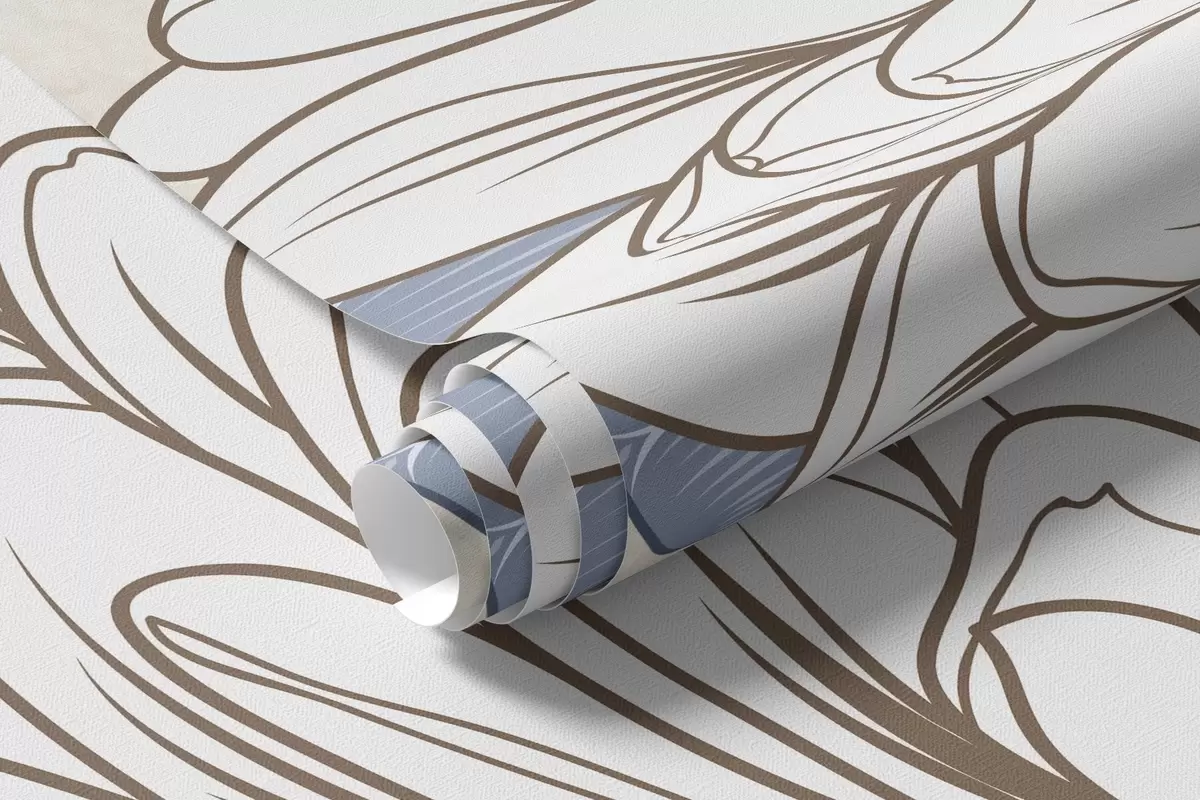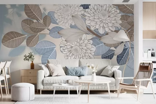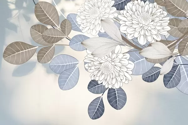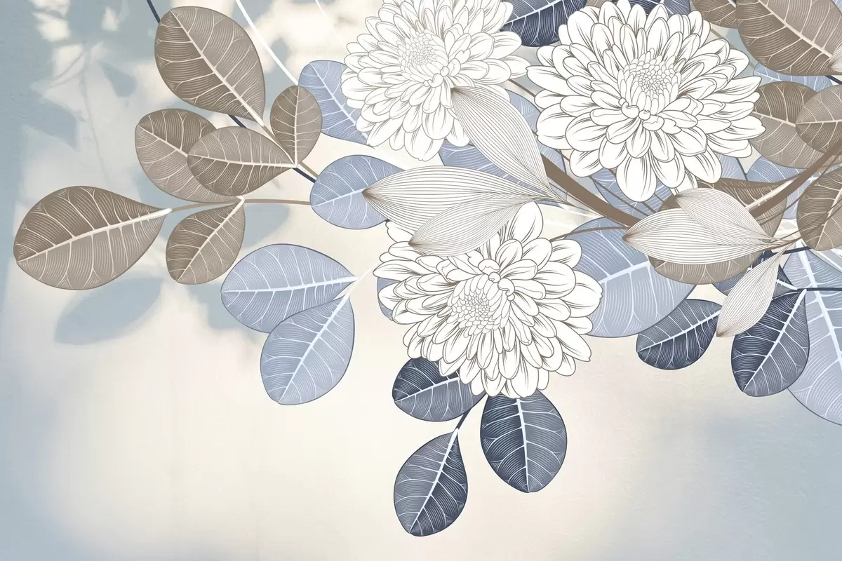 Fototapety Bílé květy s modrými a hnědými listy, světle modré texturované pozadí, květinová kompozice, detailní kresba Č. w09496