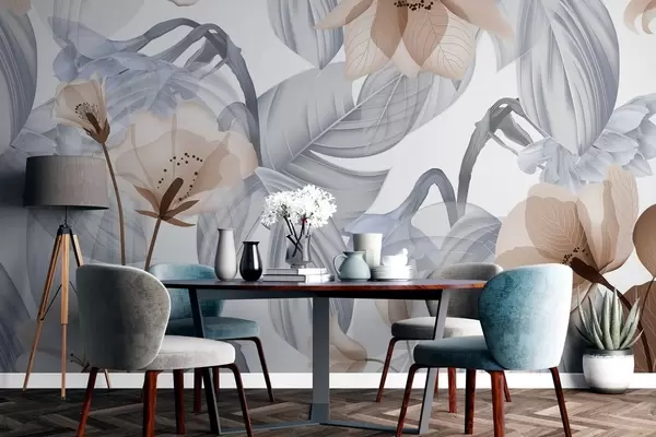 Fototapety Hnědé květy a šedé listy, květinové botanické pozadí, elegantní design, jemné barvy, lehké jemné detaily Č. w09497v1