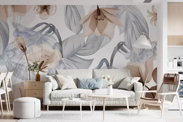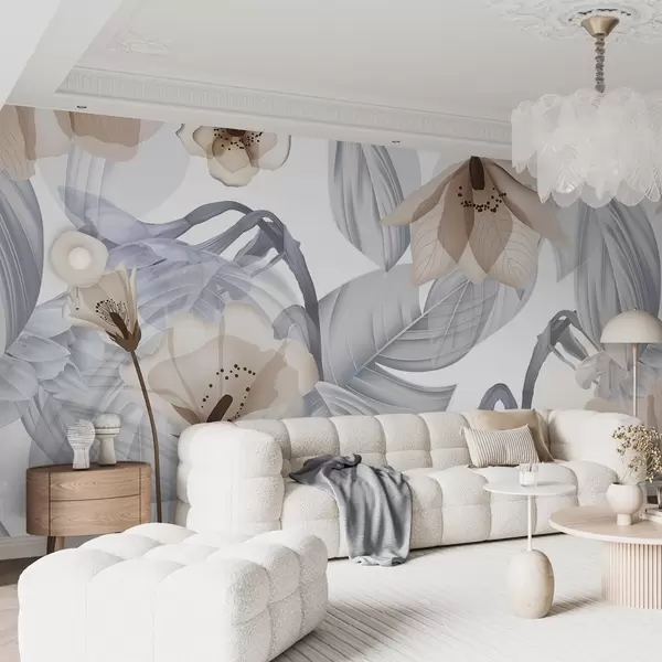 Fototapety Hnědé květy a šedé listy, květinové botanické pozadí, elegantní design, jemné barvy, lehké jemné detaily Č. w09497v1