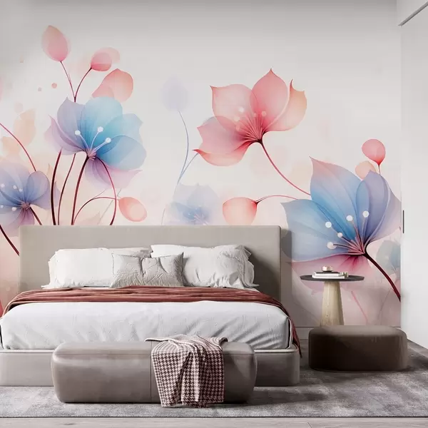 Fototapety Jemné růžovo-modré květy — vzdušná flóra na bílém akvarelovém pozadí Č. w09507