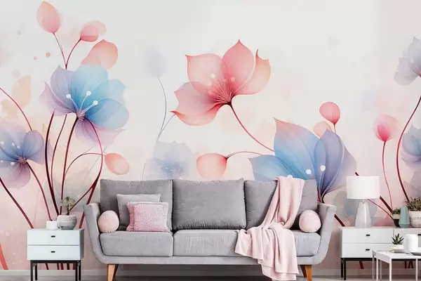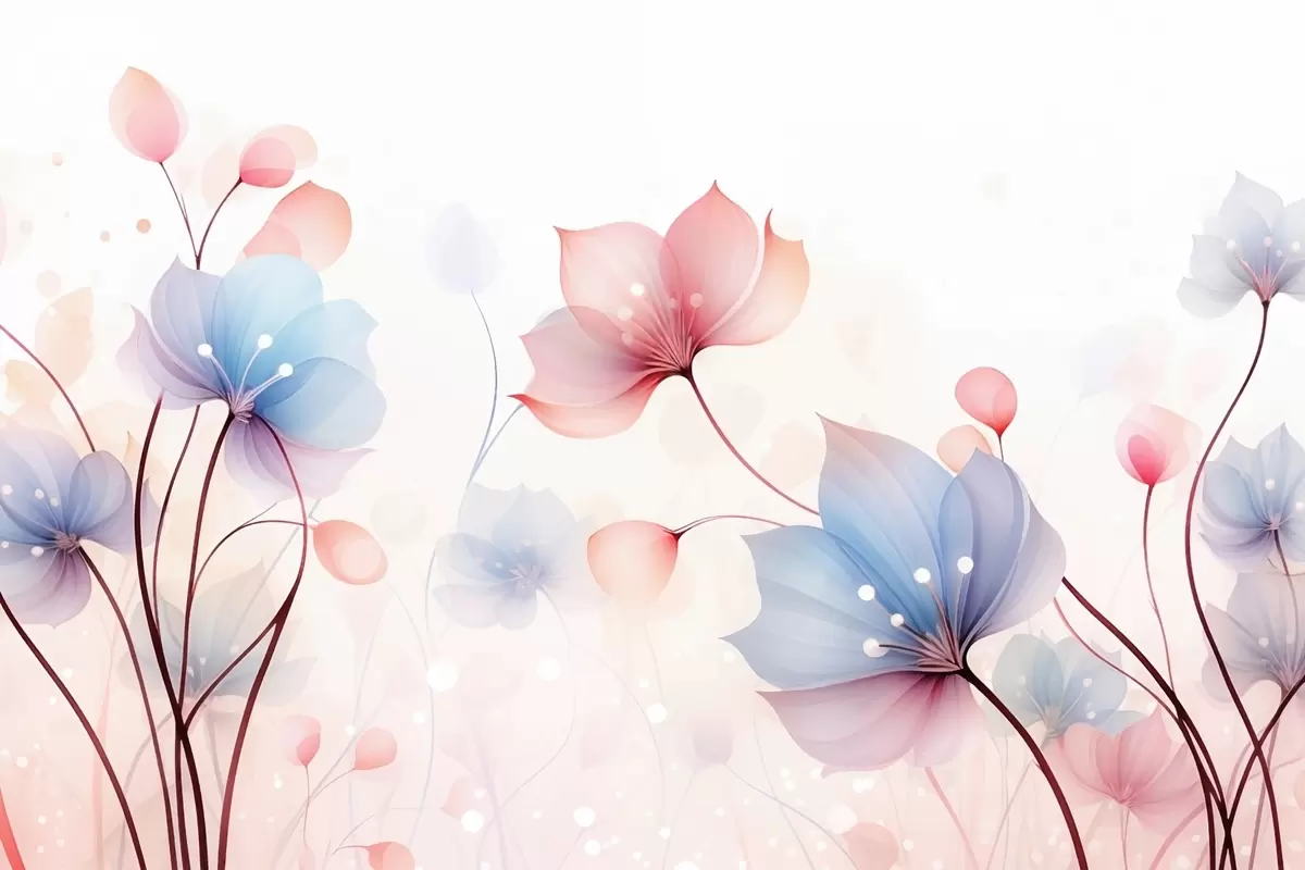 Fototapety Jemné růžovo-modré květy — vzdušná flóra na bílém akvarelovém pozadí Č. w09507