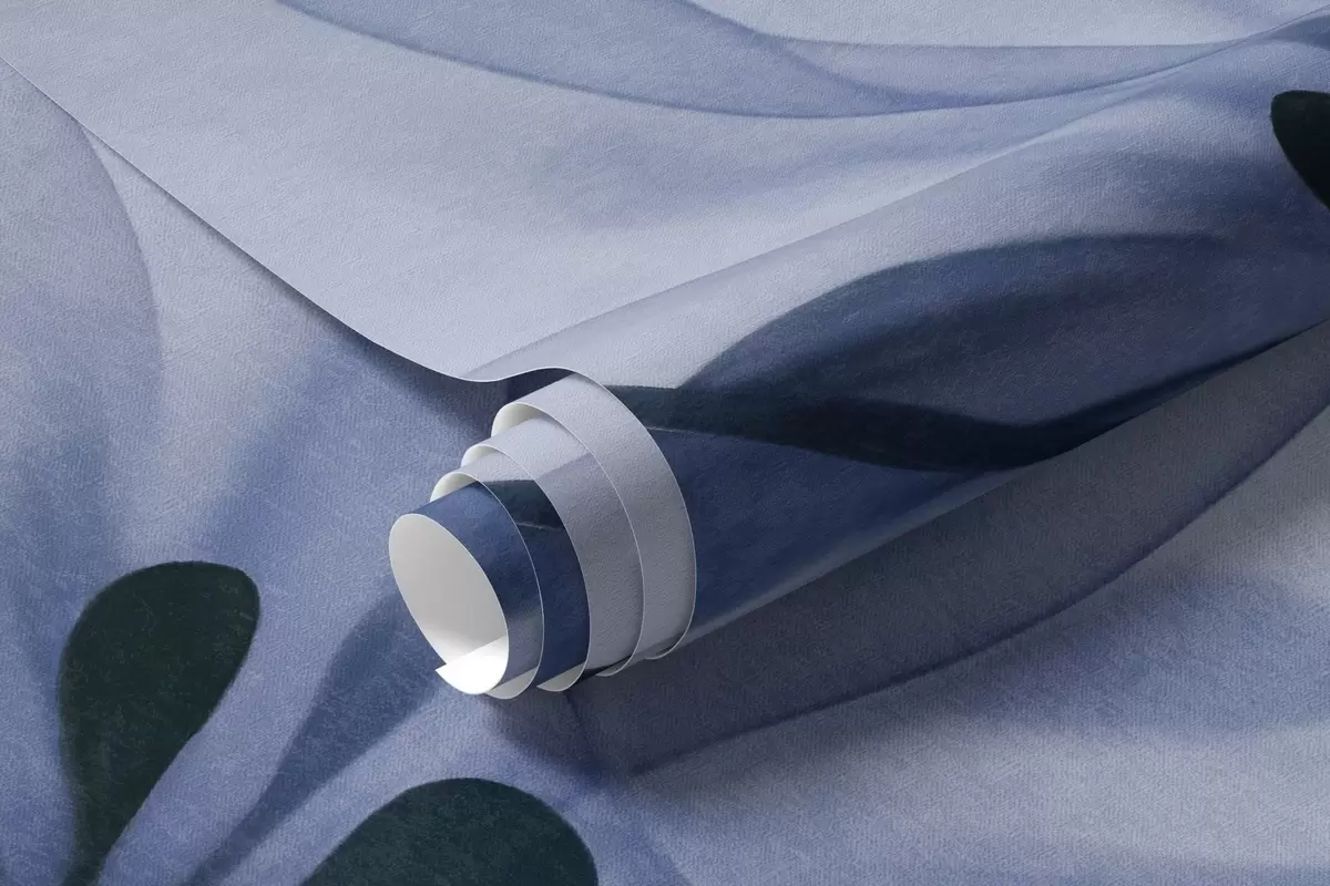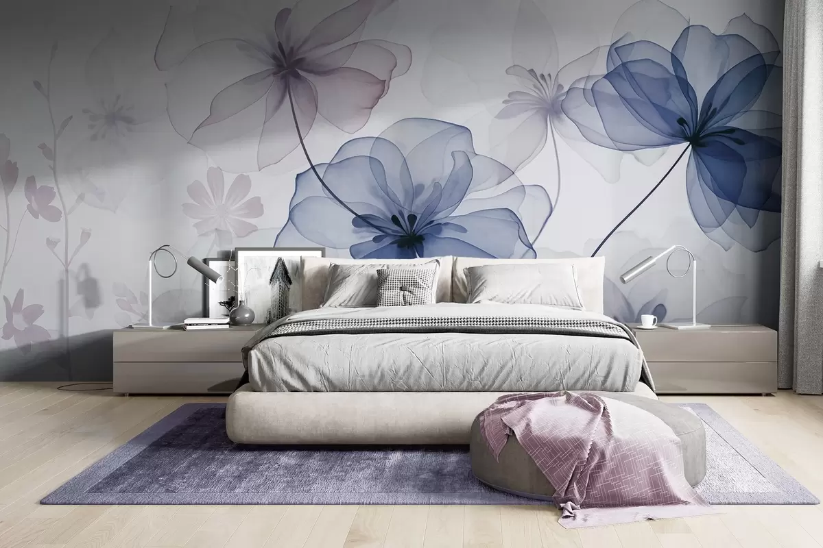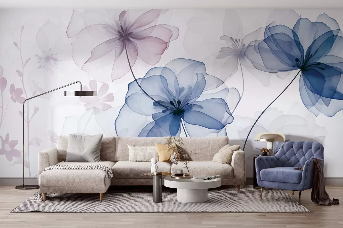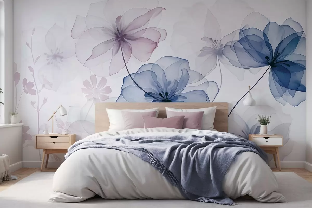 Fototapety Průsvitné květy s tlumenými modrými a růžovými okvětními lístky, dlouhé stonky, světlé pozadí, jemné barvy, texturovaný květinový vzor Č. w09529v1