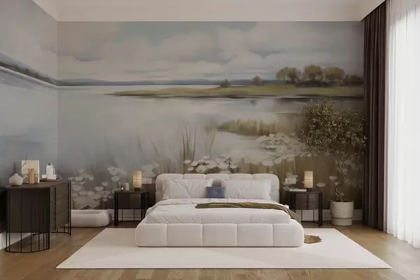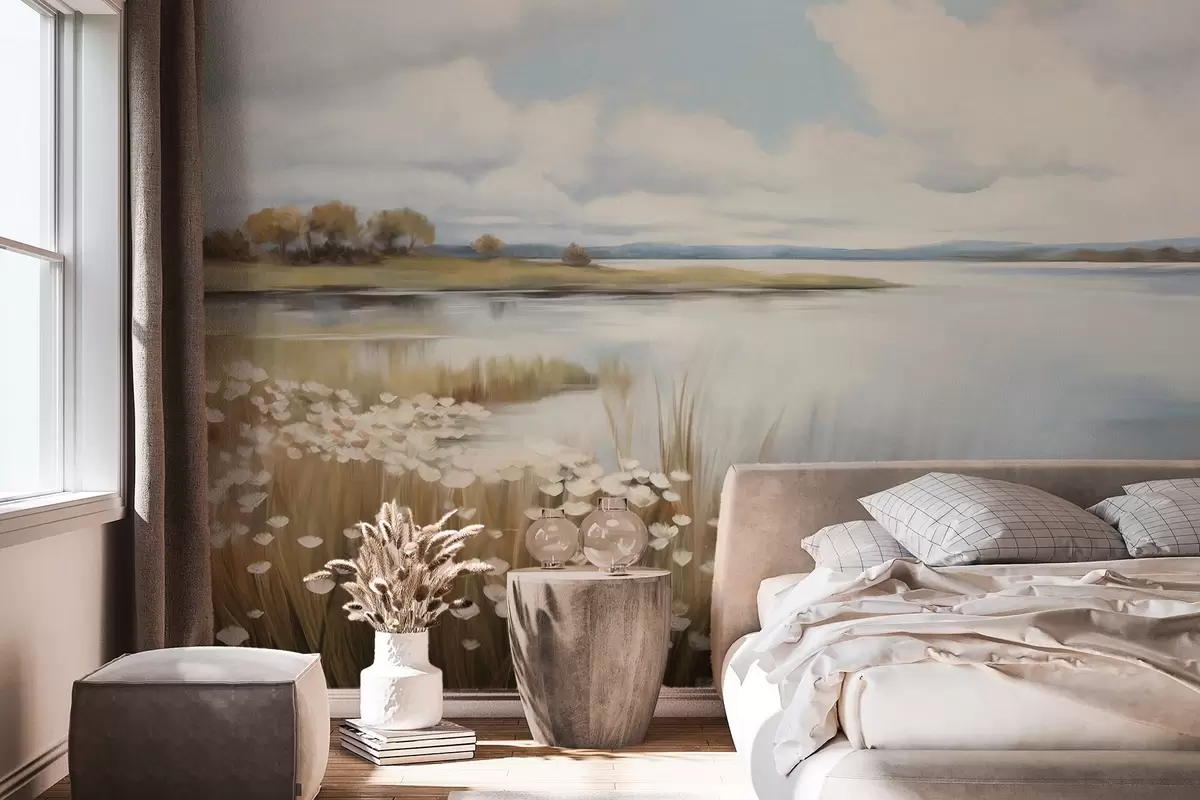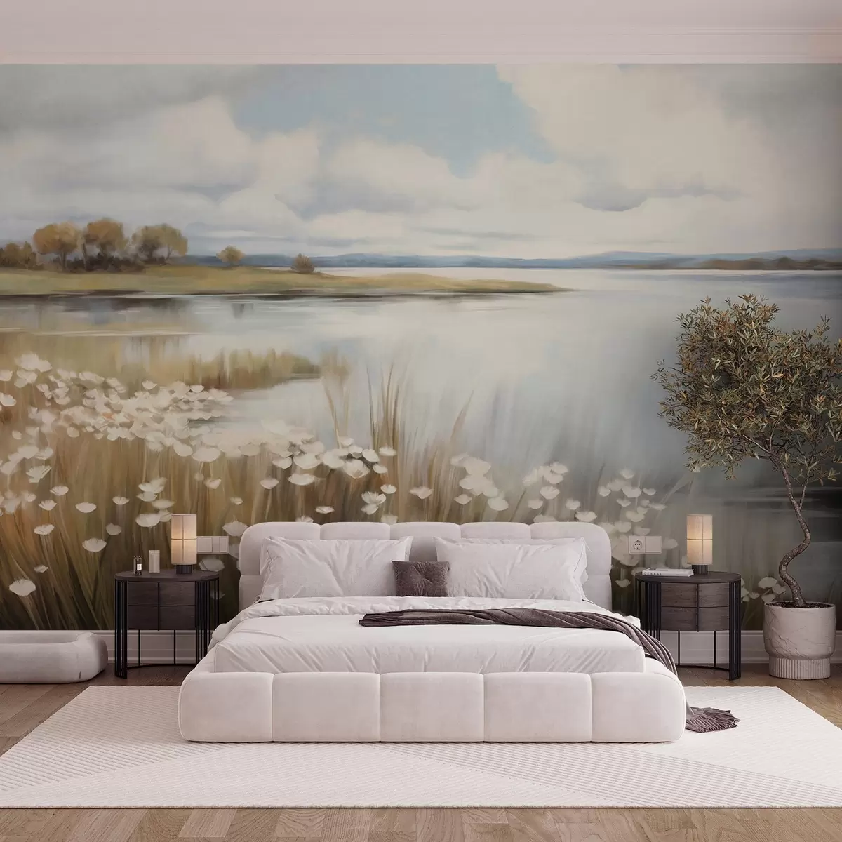 Fototapety Texturovaná krajina, pole bílých květin a vysoké trávy, jezero v pozadí, travnatý kopec se stromy, jemné barvy Č. w09530