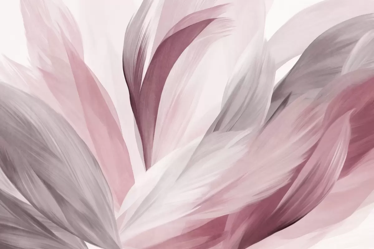 Fototapety Abstraktní texturované peří v růžové, bílé a šedé barvě a různých odstínech, překrývající se na bílém pozadí Č. w09531v2