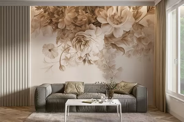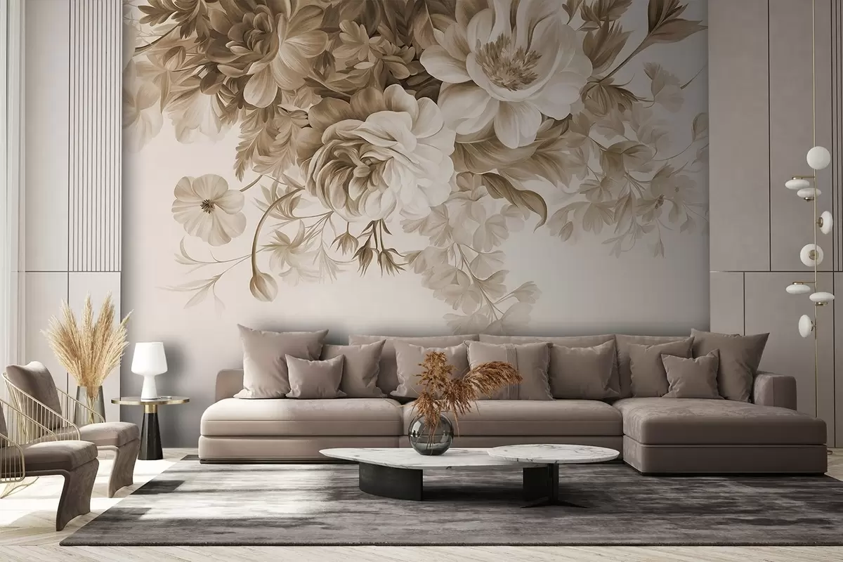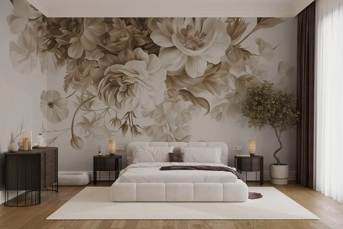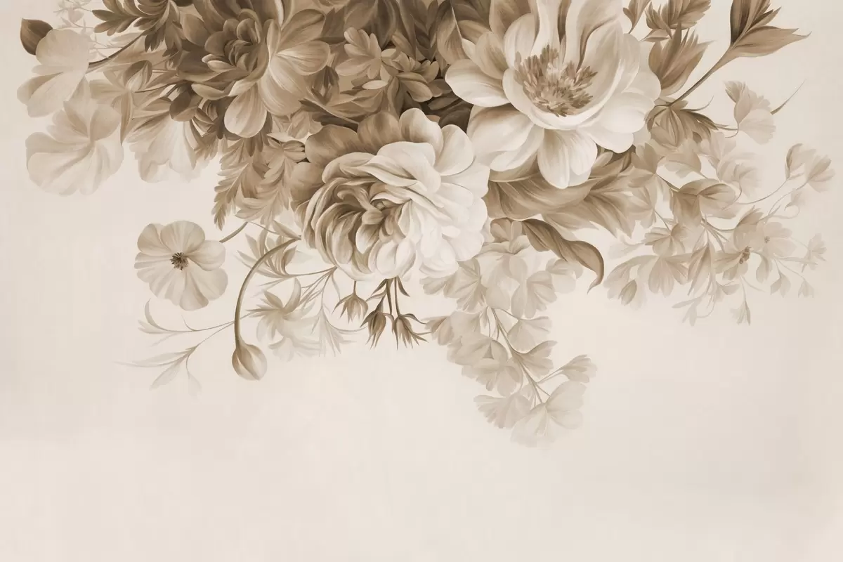 Fototapety Vintage květinová kompozice s růžemi, pivoňkami a dalšími texturovanými květinami s listovím na světlém pozadí Č. w09532v1
