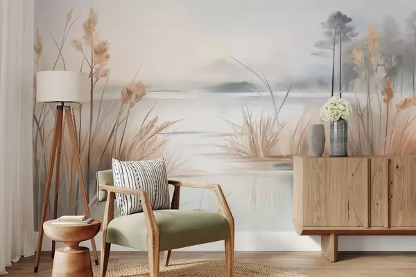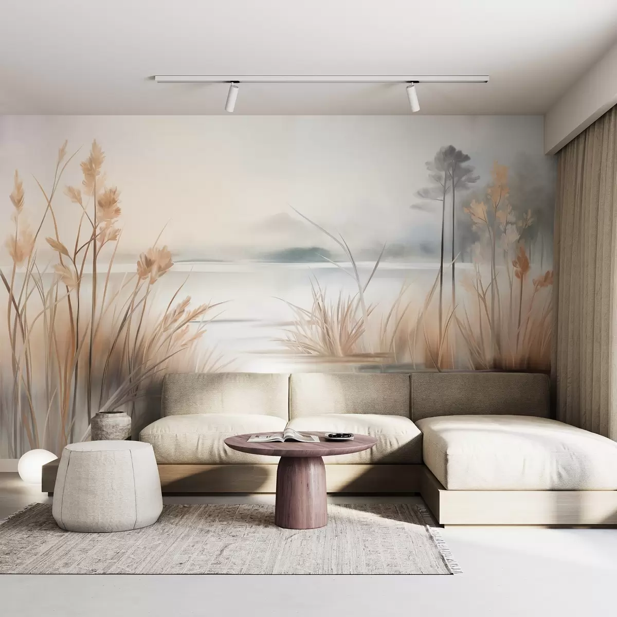 Fototapety Krajina s jezerem a vysokou trávou v popředí, hory v pozadí, jemné barvy, texturovaná Č. w09534