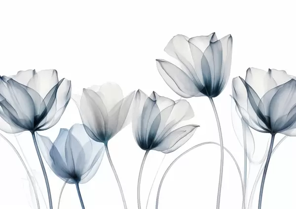 Fototapety Průsvitné modré a bílé tulipány s dlouhými stonky na světlém pozadí, jemné a strukturované květinové umění Č. w09538