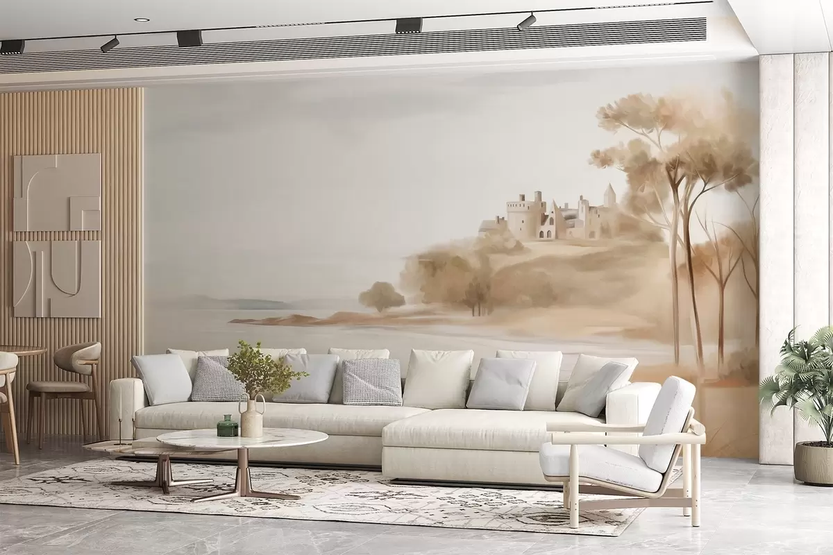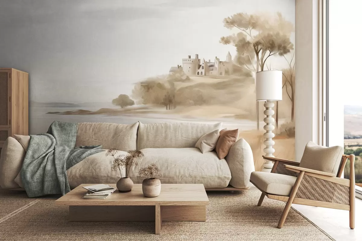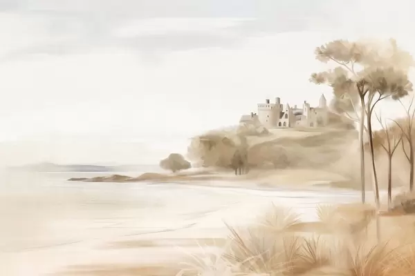 Fototapety Krajina s hradem na kopci u moře, písečná pláž v popředí, tlumené barvy, texturované umění Č. w09540