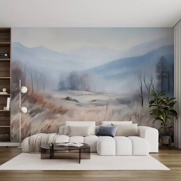 Fototapety Texturovaná krajina se suchou trávou v popředí a stromy v pozadí, s horami v dálce Č. w09542