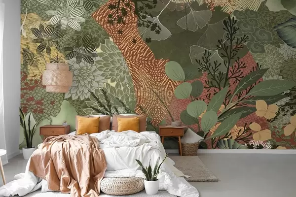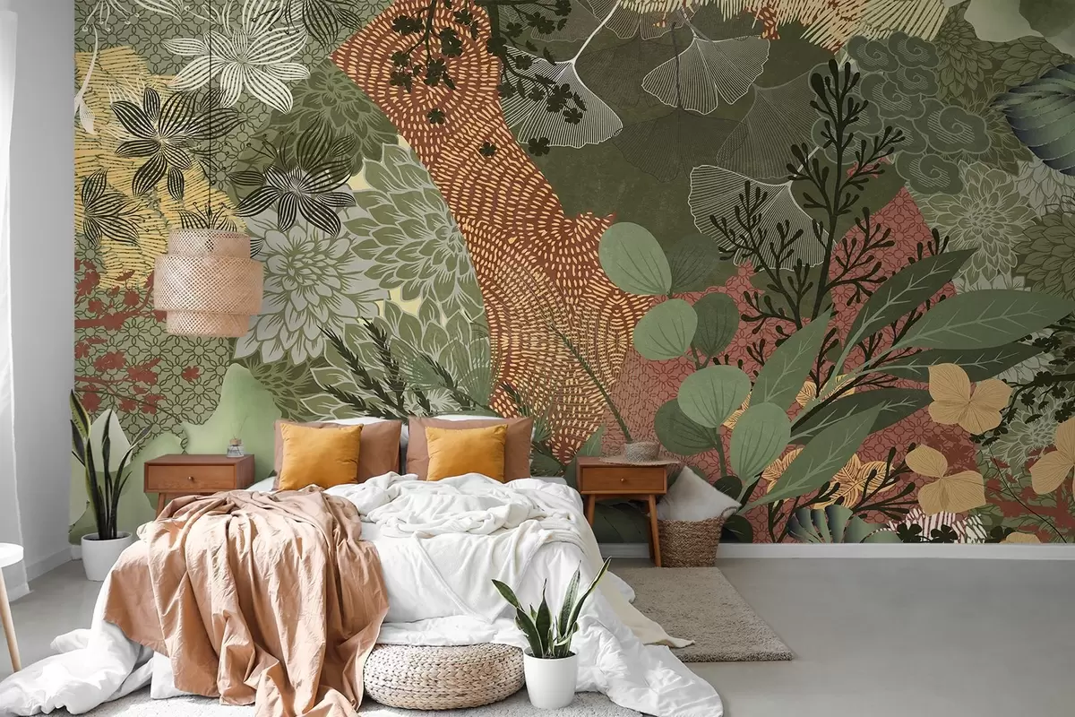Fototapety Abstraktní koláž botanických prvků s listy, květinami a organickými texturami v odstínech zelené a hnědé barvy. Č. w09545