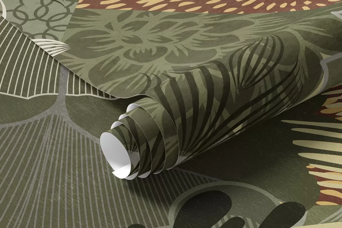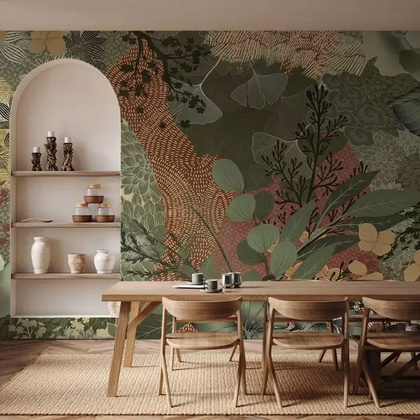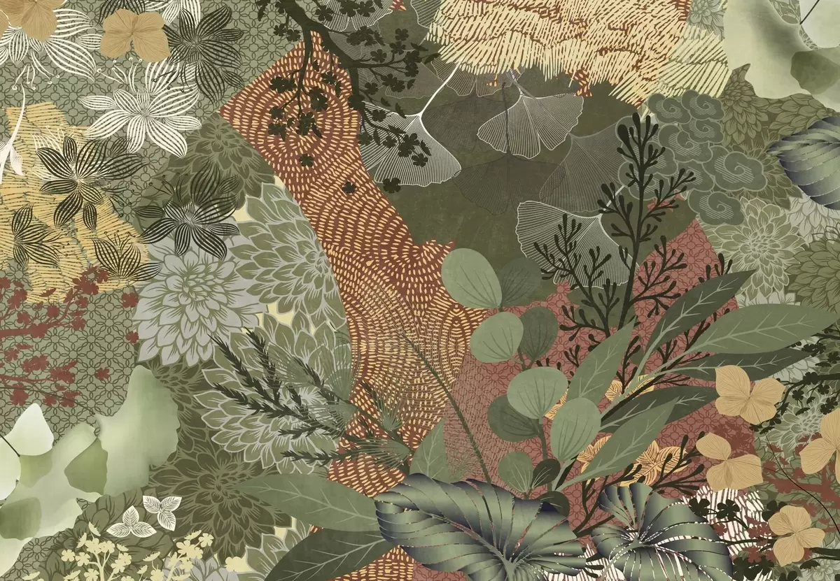 Fototapety Abstraktní koláž botanických prvků s listy, květinami a organickými texturami v odstínech zelené a hnědé barvy. Č. w09545