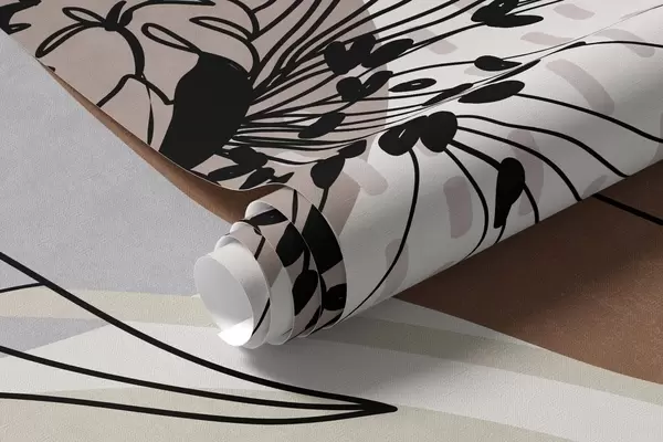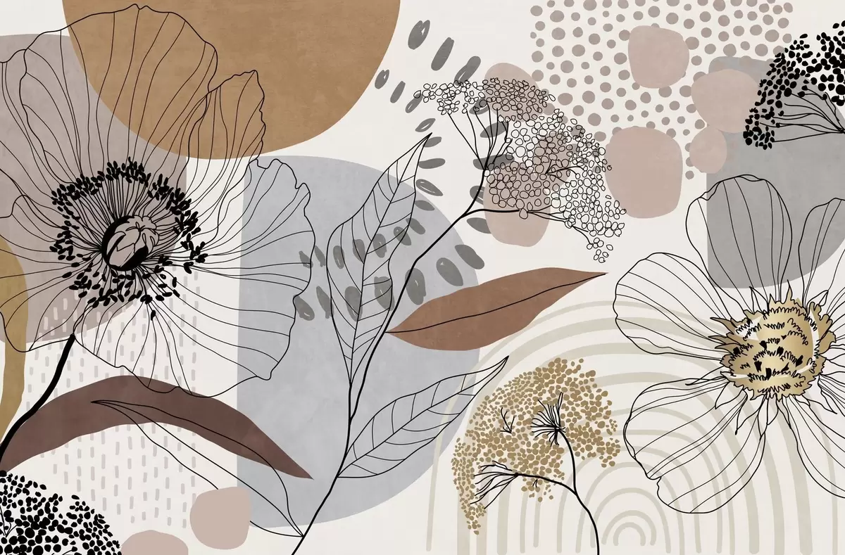 Fototapety Abstraktní květinový potisk s liniovými kresbami květin, listů a organických tvarů v tlumených hnědých, béžových a šedých tónech. Č. w09548