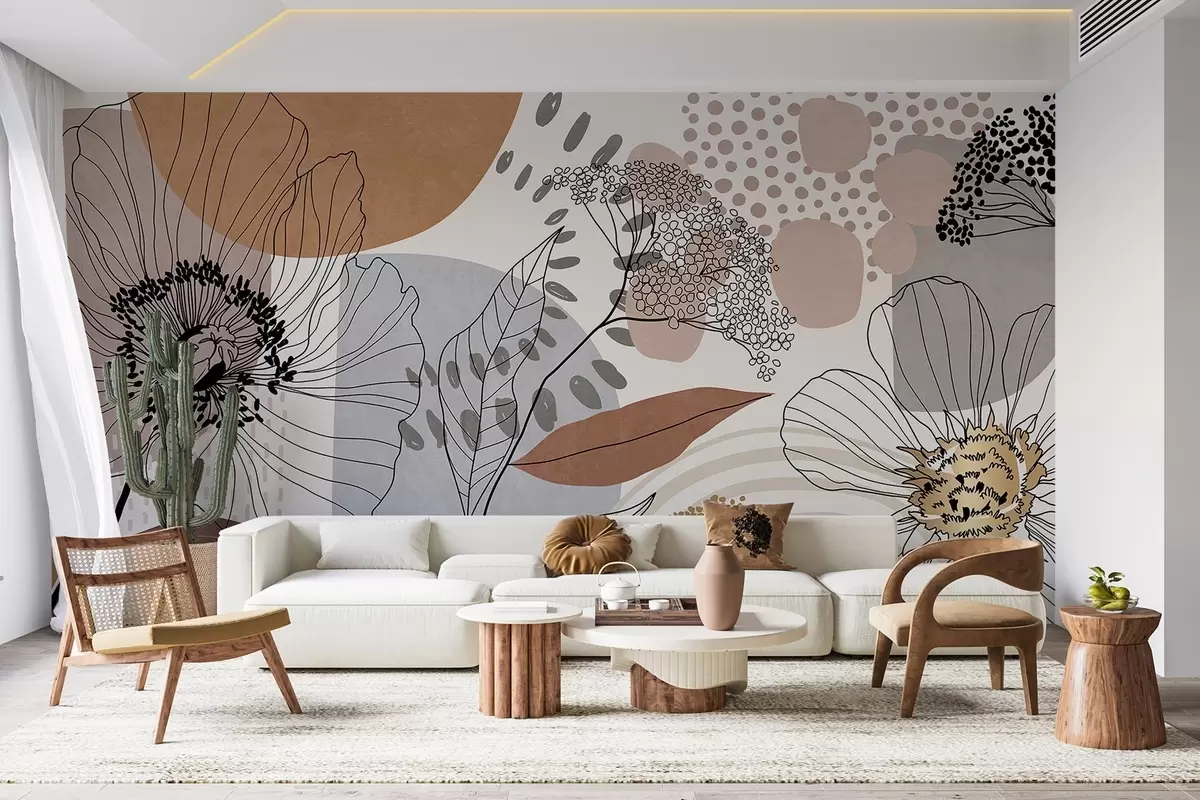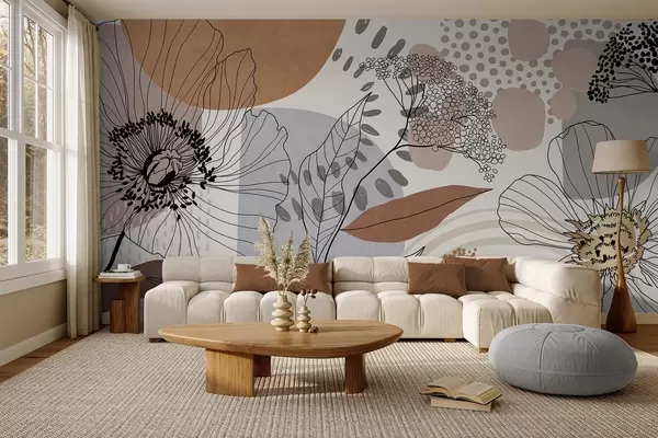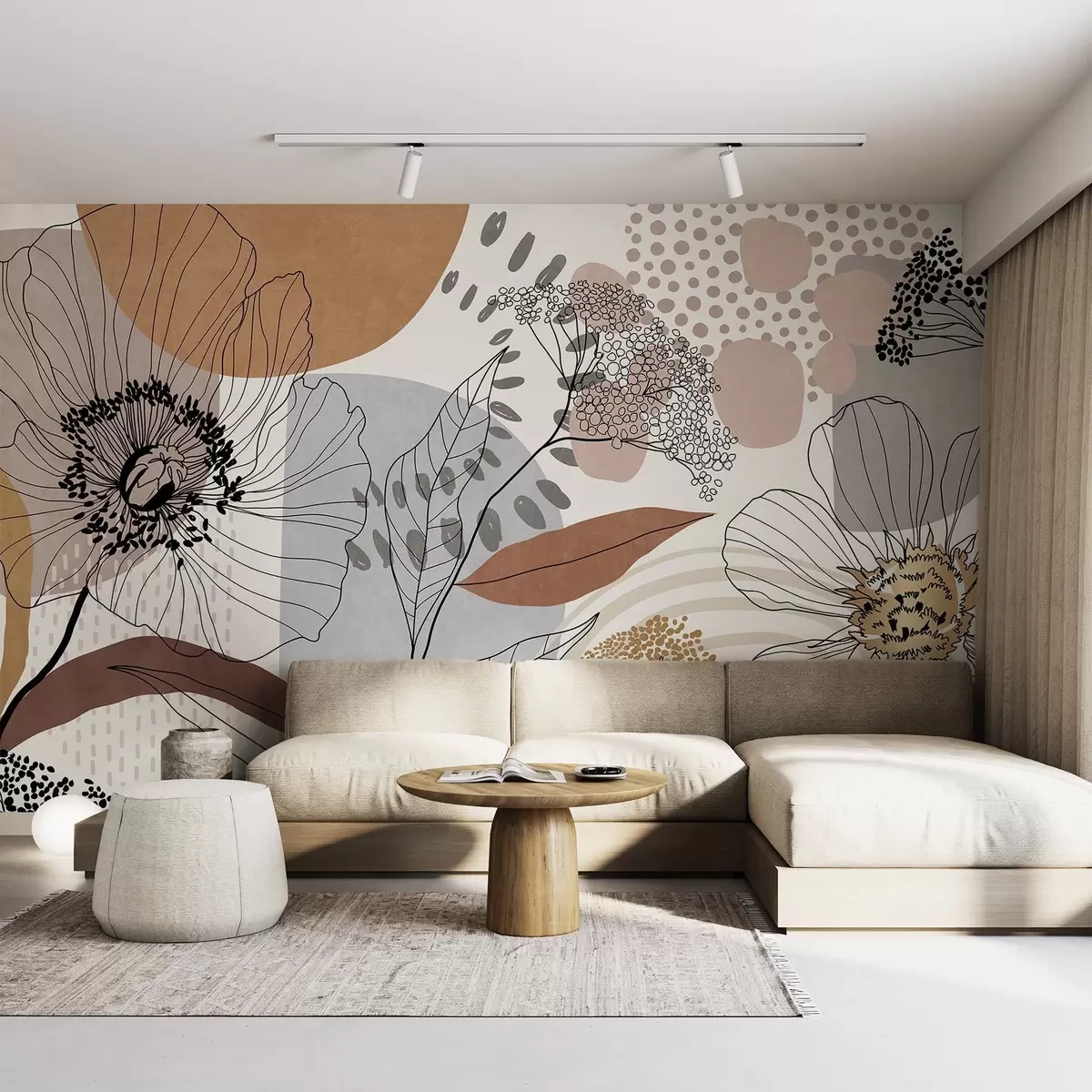 Fototapety Abstraktní květinový potisk s liniovými kresbami květin, listů a organických tvarů v tlumených hnědých, béžových a šedých tónech. Č. w09548