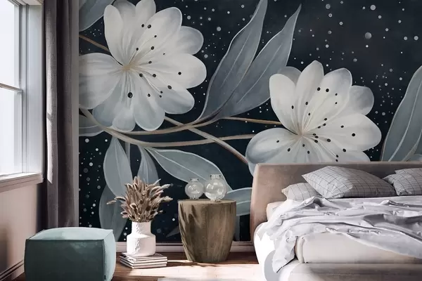 Fototapety Fantastické bílé květy s texturou, obklopené modrozelenými listy a větvemi na tmavém pozadí Č. w09551
