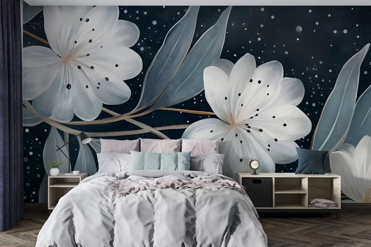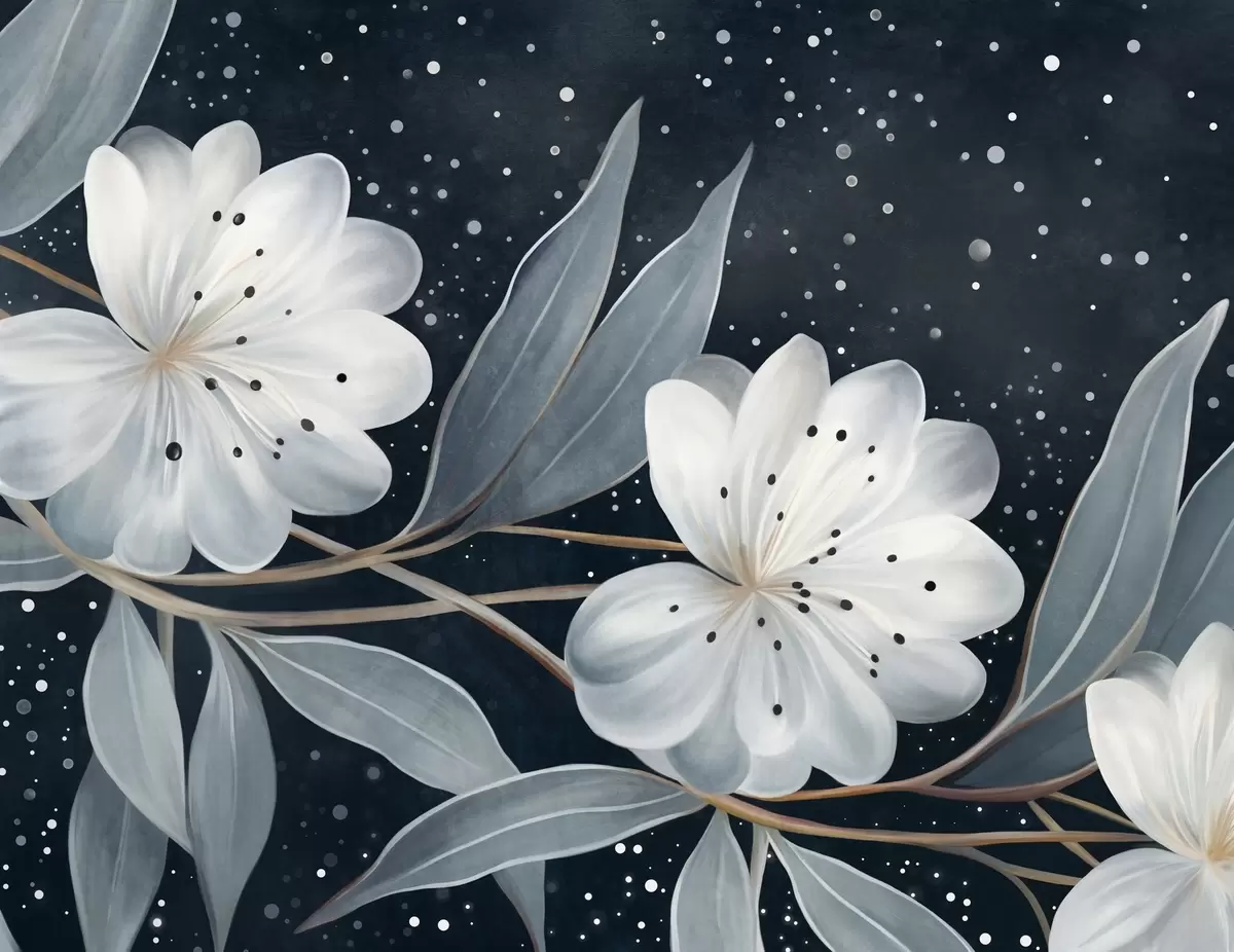 Fototapety Fantastické bílé květy s texturou, obklopené modrozelenými listy a větvemi na tmavém pozadí Č. w09551