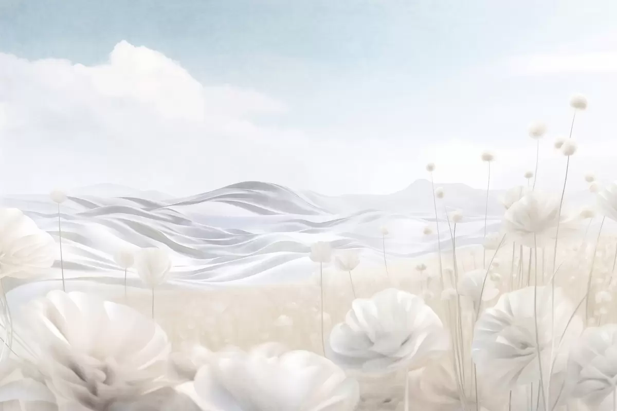 Fototapet Texturované pole krémových máků s kopcovitým terénem pod bledě modrou oblohou s měkkými mraky, pastelové barvy w09553