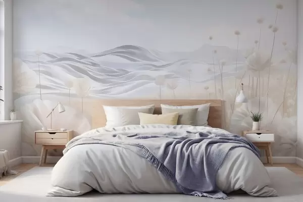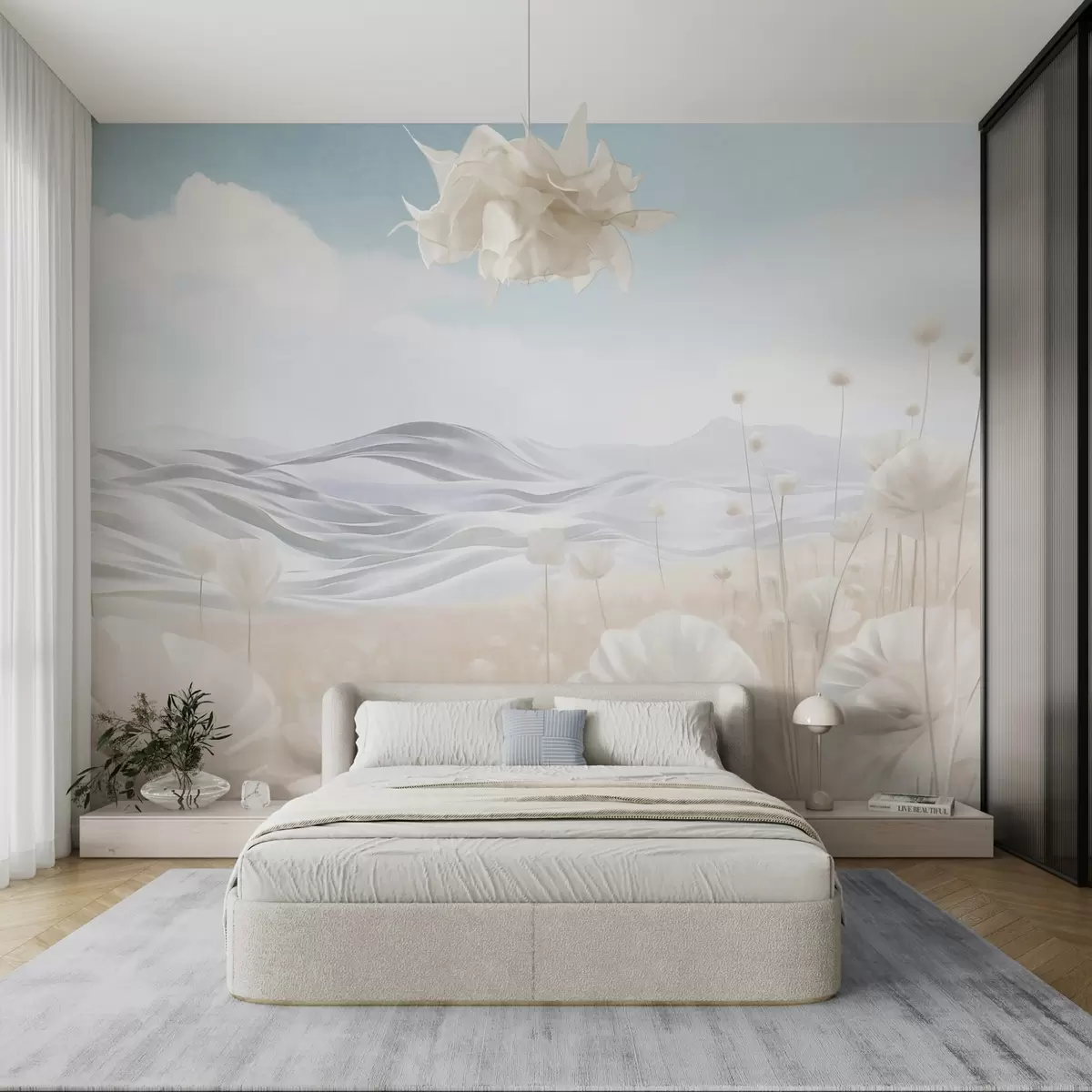 Fototapety Texturované pole krémových máků s kopcovitým terénem pod bledě modrou oblohou s měkkými mraky, pastelové barvy Č. w09553