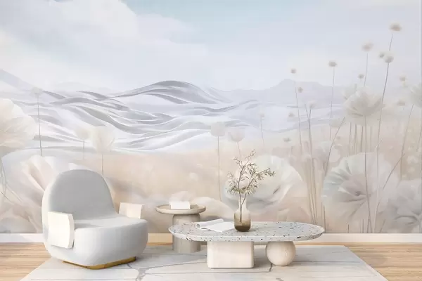 Fototapety Texturované pole krémových máků s kopcovitým terénem pod bledě modrou oblohou s měkkými mraky, pastelové barvy Č. w09553