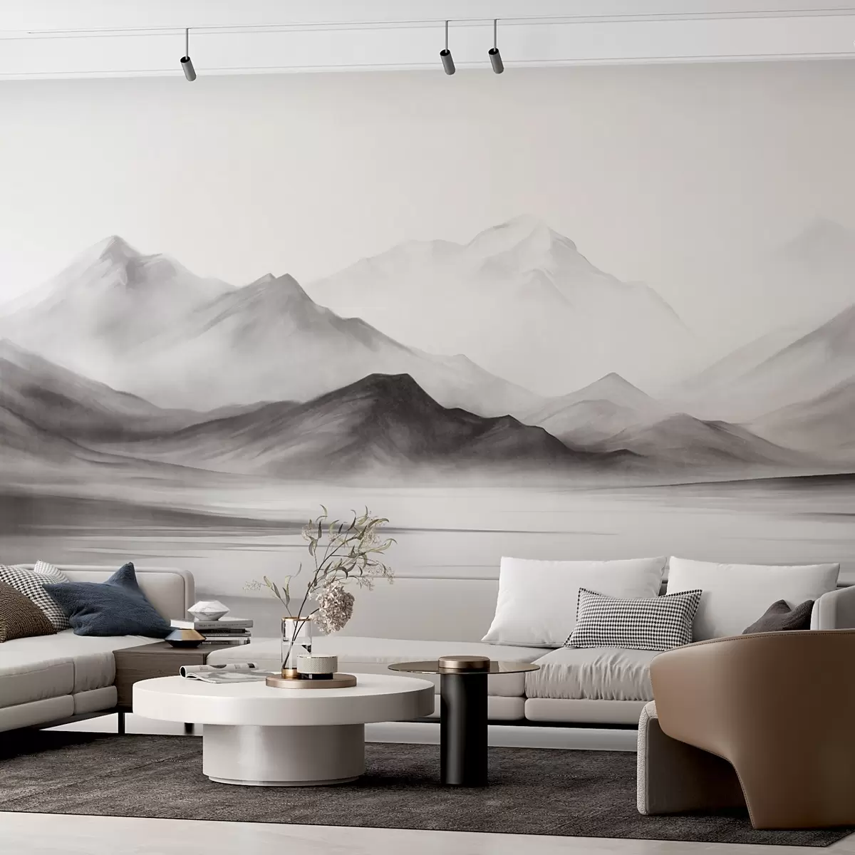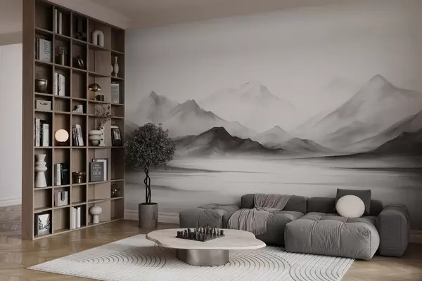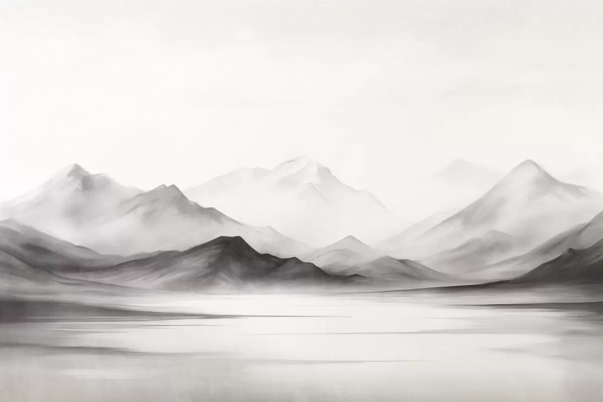 Fototapety Monochromatická texturovaná krajina s mlhavými horami a jezerem v popředí Č. w09555