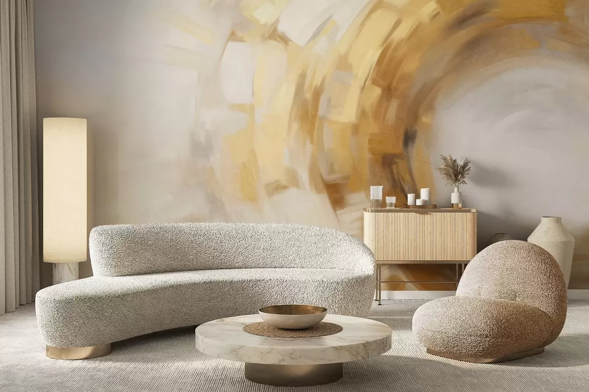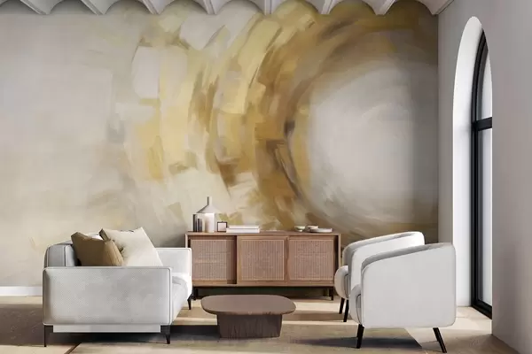 Fototapety Abstraktní malba imitující kruhové texturované tahy štětcem ve žluté a bílé barvě, vytvářející dojem pohybu. Č. w09558