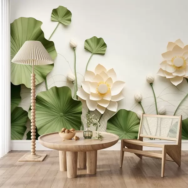 Fototapety 3D lotosové květy se zelenými texturovanými listy, minimalistický styl Č. w09560