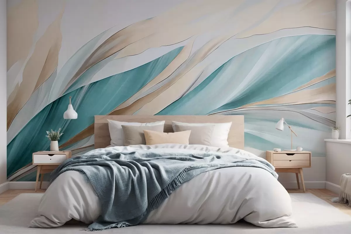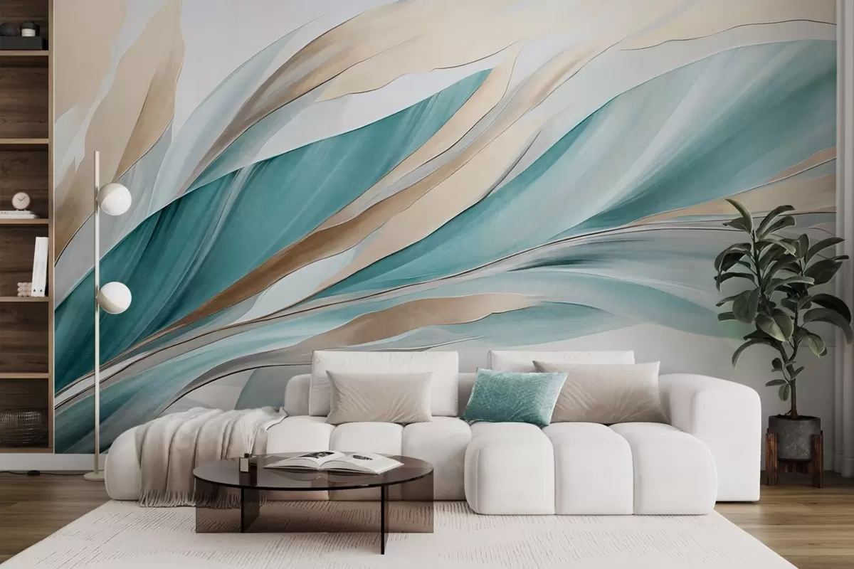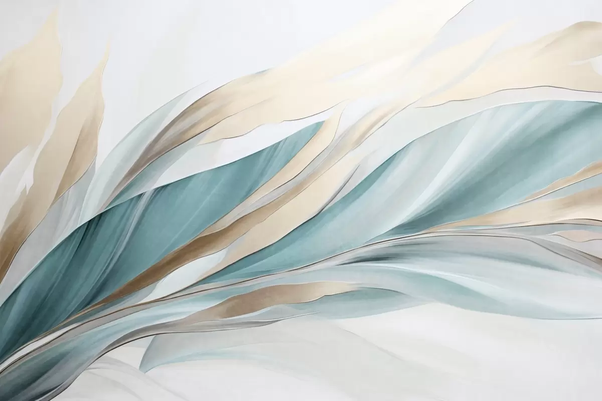 Fototapety Abstraktní vlny v barvách modrozelené a žluté, s tenkými tvary a liniemi, na bílém pozadí, texturované umění Č. w09585