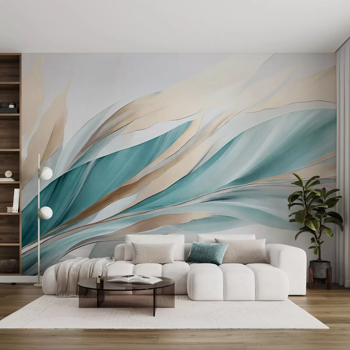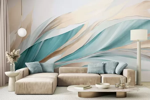 Fototapety Abstraktní vlny v barvách modrozelené a žluté, s tenkými tvary a liniemi, na bílém pozadí, texturované umění Č. w09585
