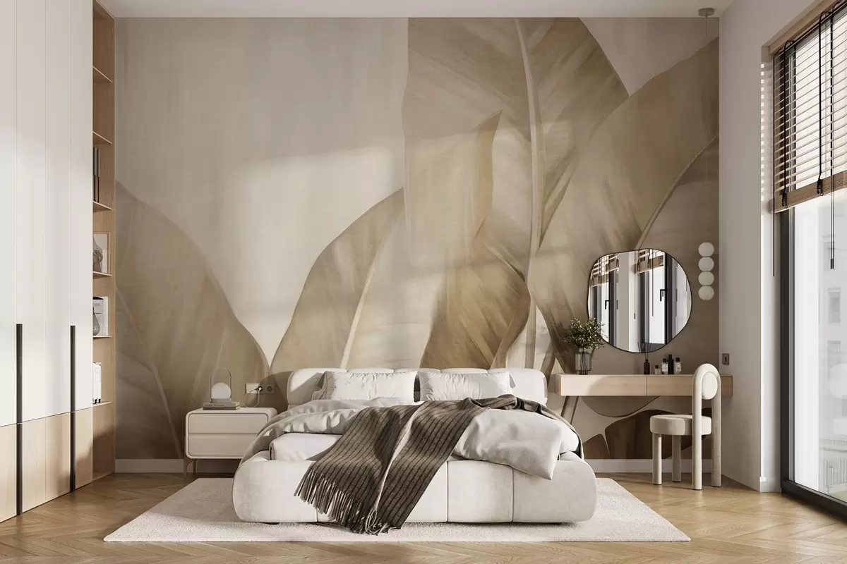 Fototapety Velké, světle hnědé banánové listy s texturou na světle béžovém pozadí, s jemnou a minimalistickou estetikou Č. w09586