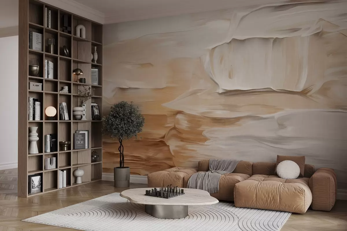 Fototapety Abstraktní imitace texturovaných tahů štětcem v teplých zemitých tónech béžové, krémové a hnědé, moderní umění Č. w09588