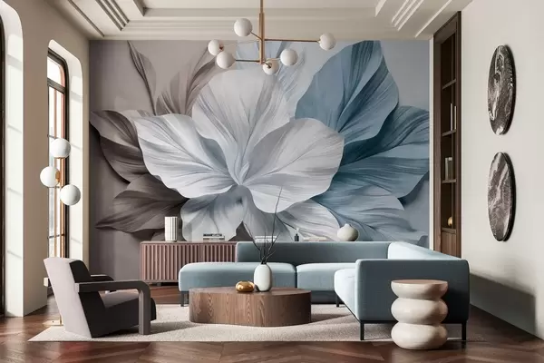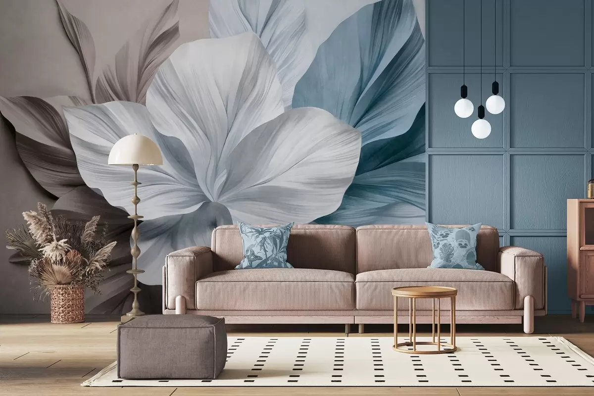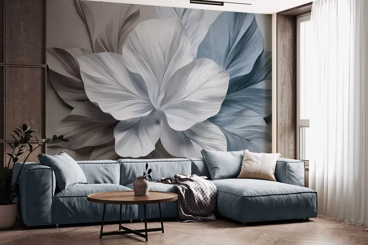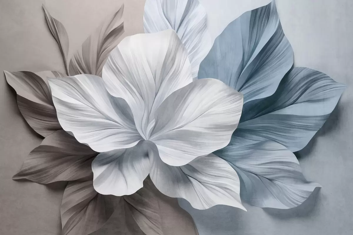 Fototapety Abstraktní květina s mnoha okvětními lístky a texturovanými listy v odstínech hnědé a modré barvy, jemné pozadí Č. w09604v1