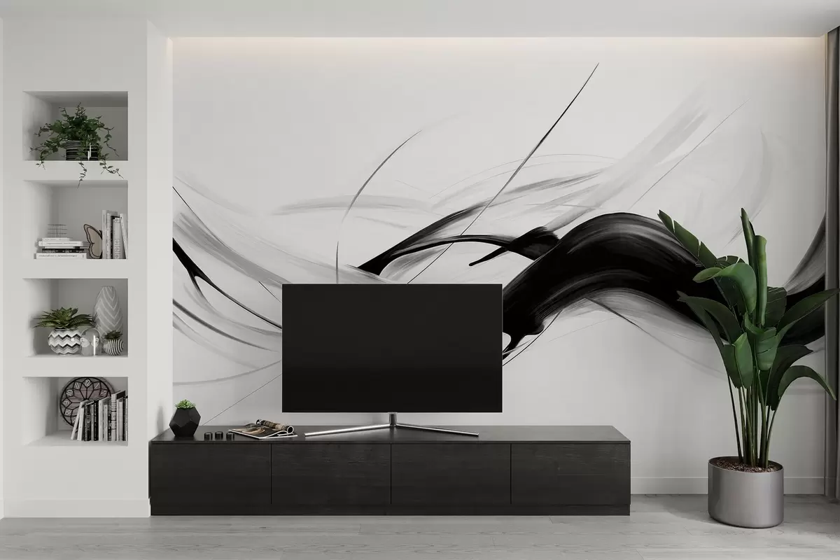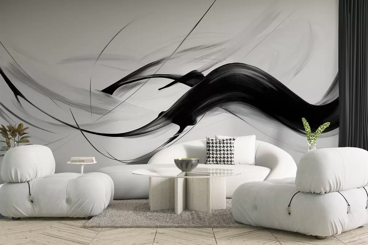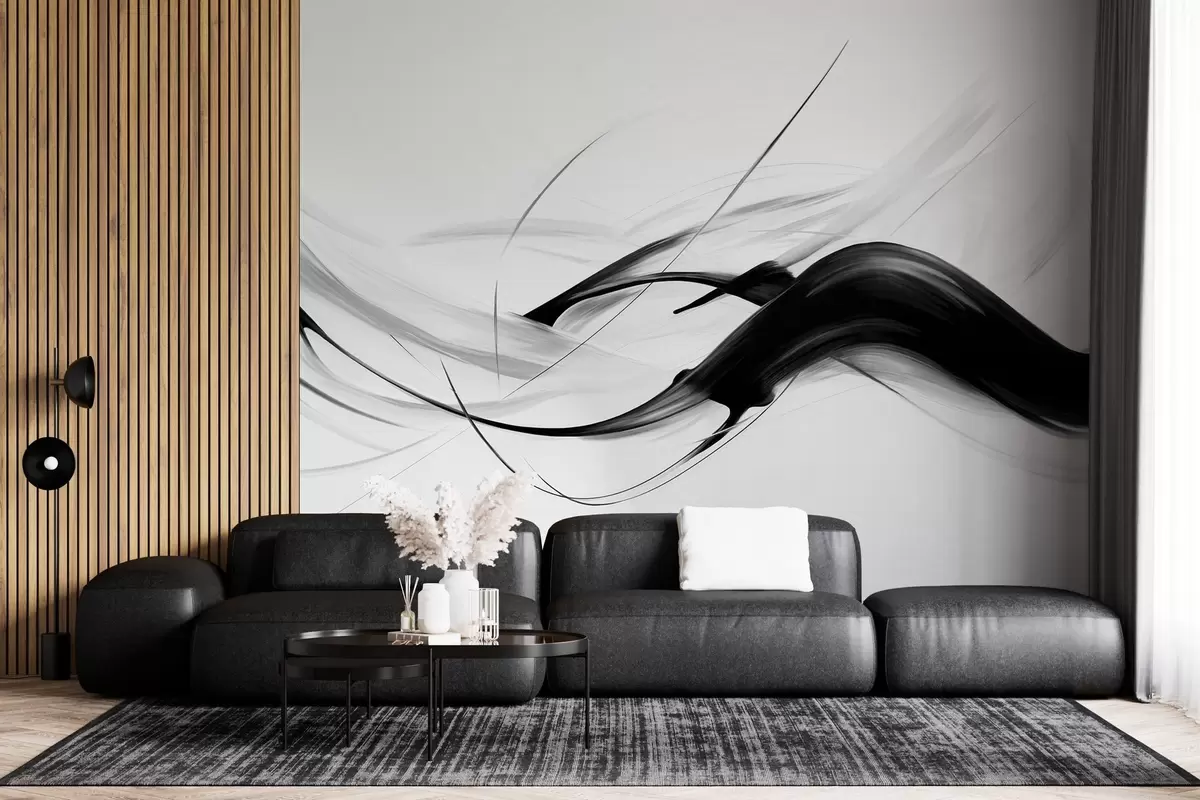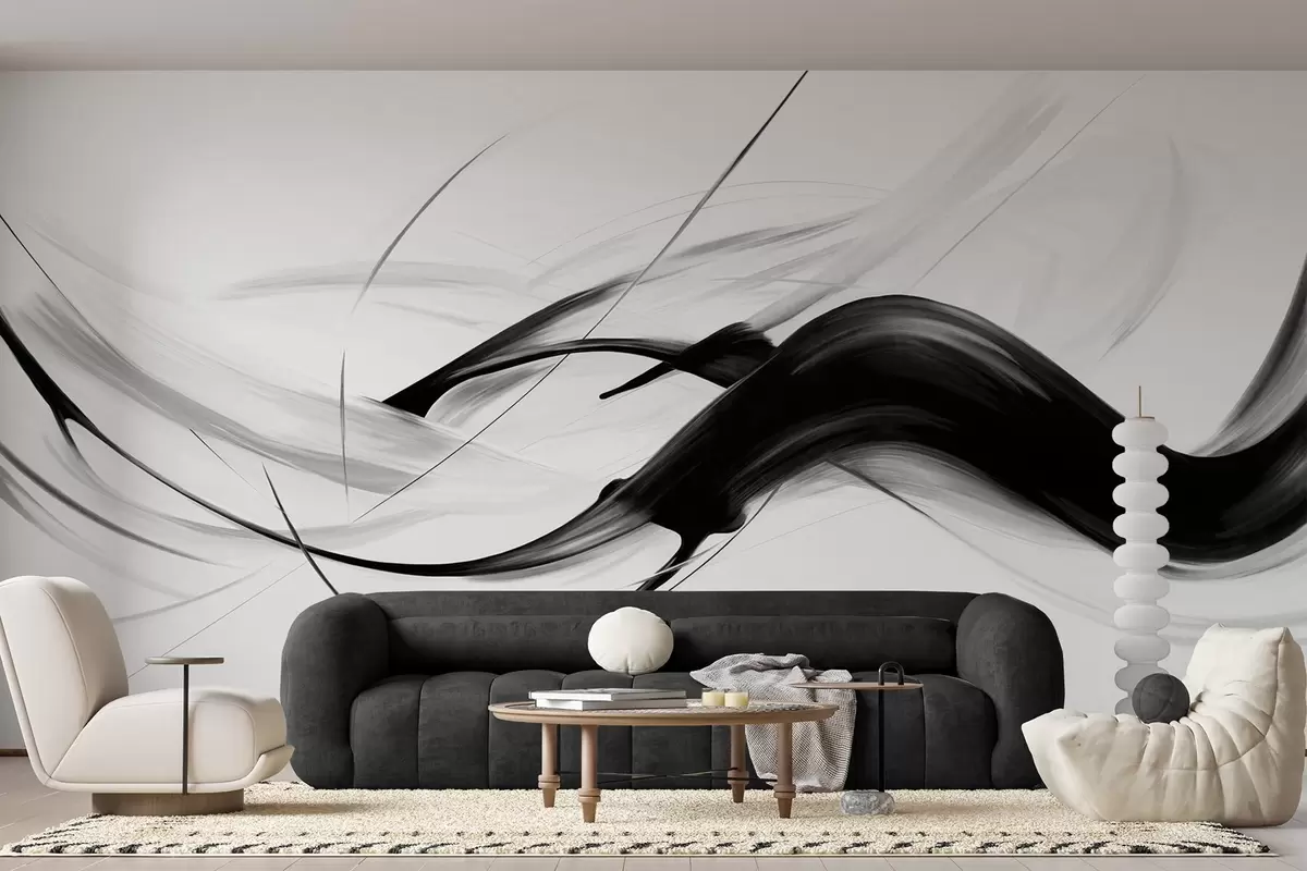Fototapety Abstraktní černobílé tahy štětcem s tenkými čarami vytvářejí moderní design na světlém pozadí. Č. w09605