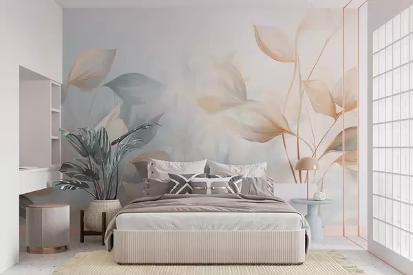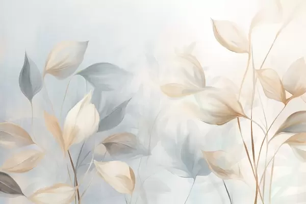 Fototapety Jemné, delikátní, průsvitné listy v tlumených odstínech béžové, broskvové a světle modré barvy, texturované pastelové umění Č. w09607