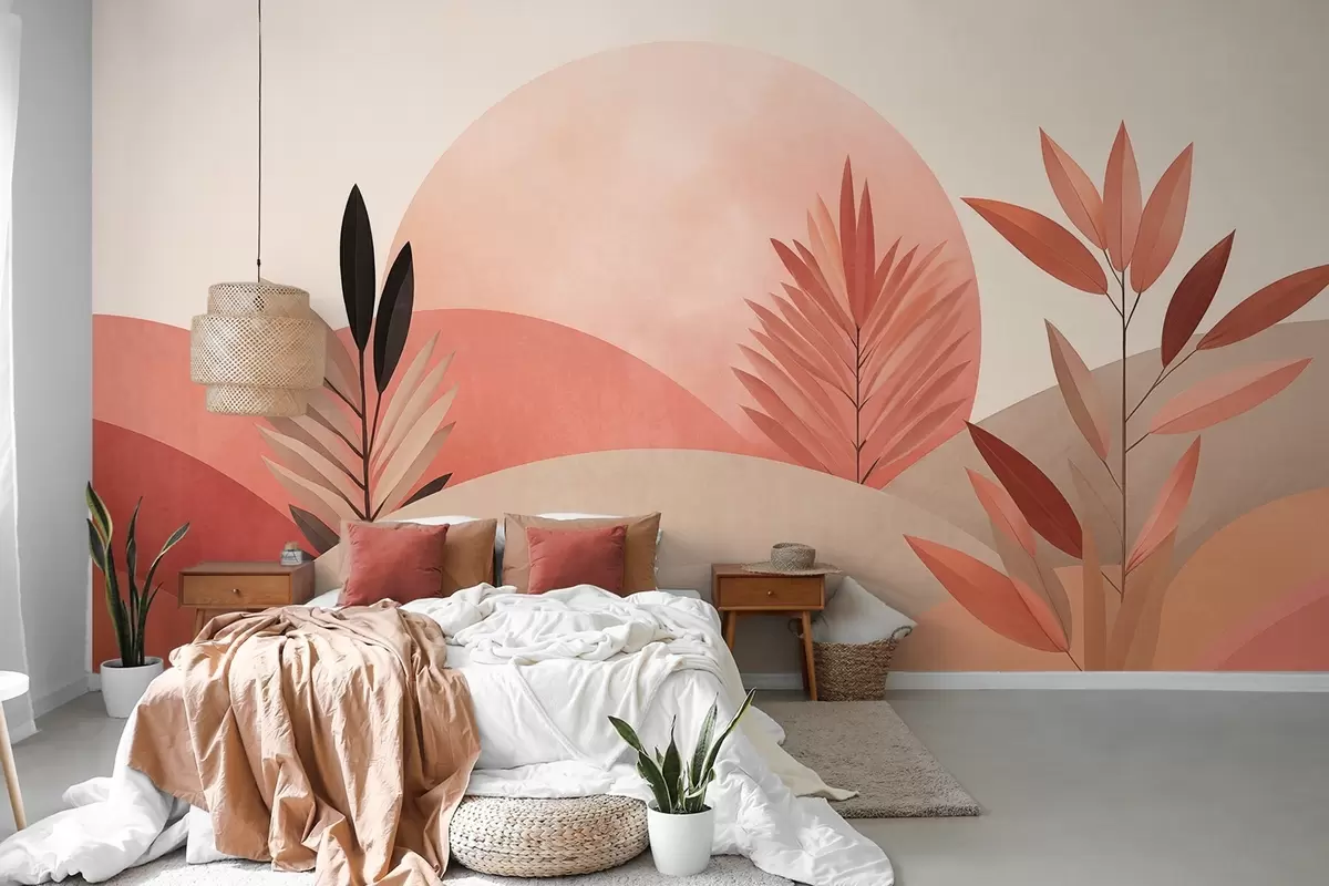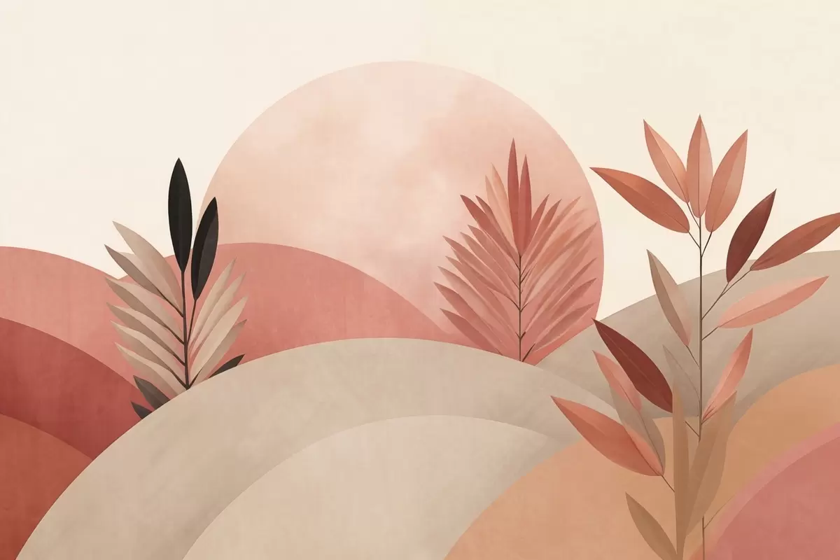 Fototapety Abstraktní boho krajina, slunce za zvlněnými kopci, rostliny v popředí, minimalistické, texturované, tlumené barvy Č. w09608