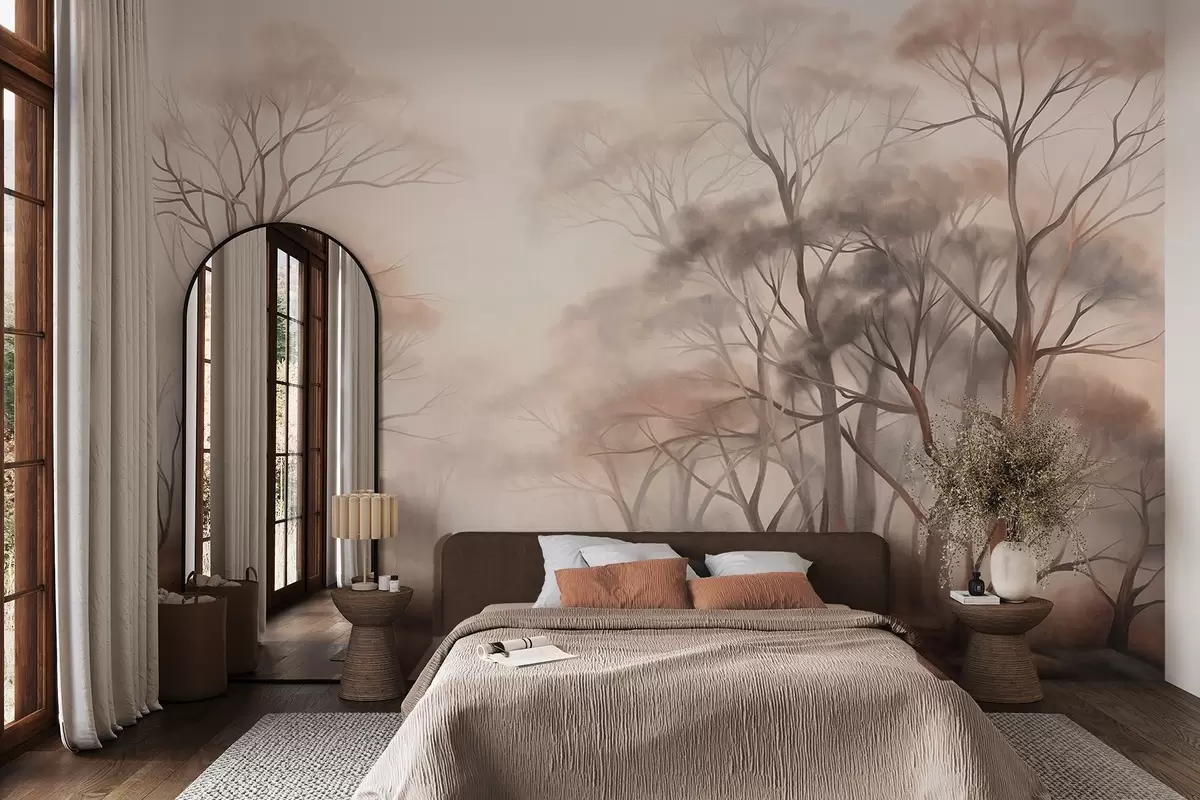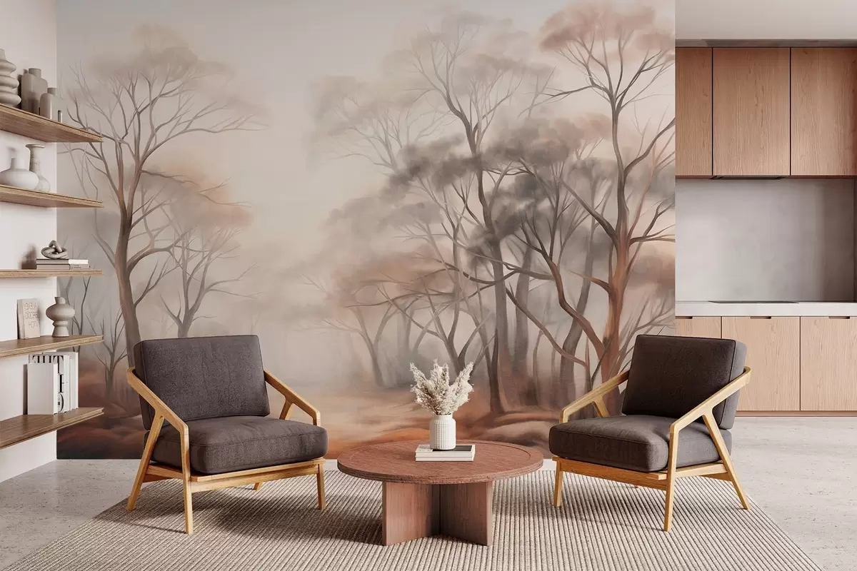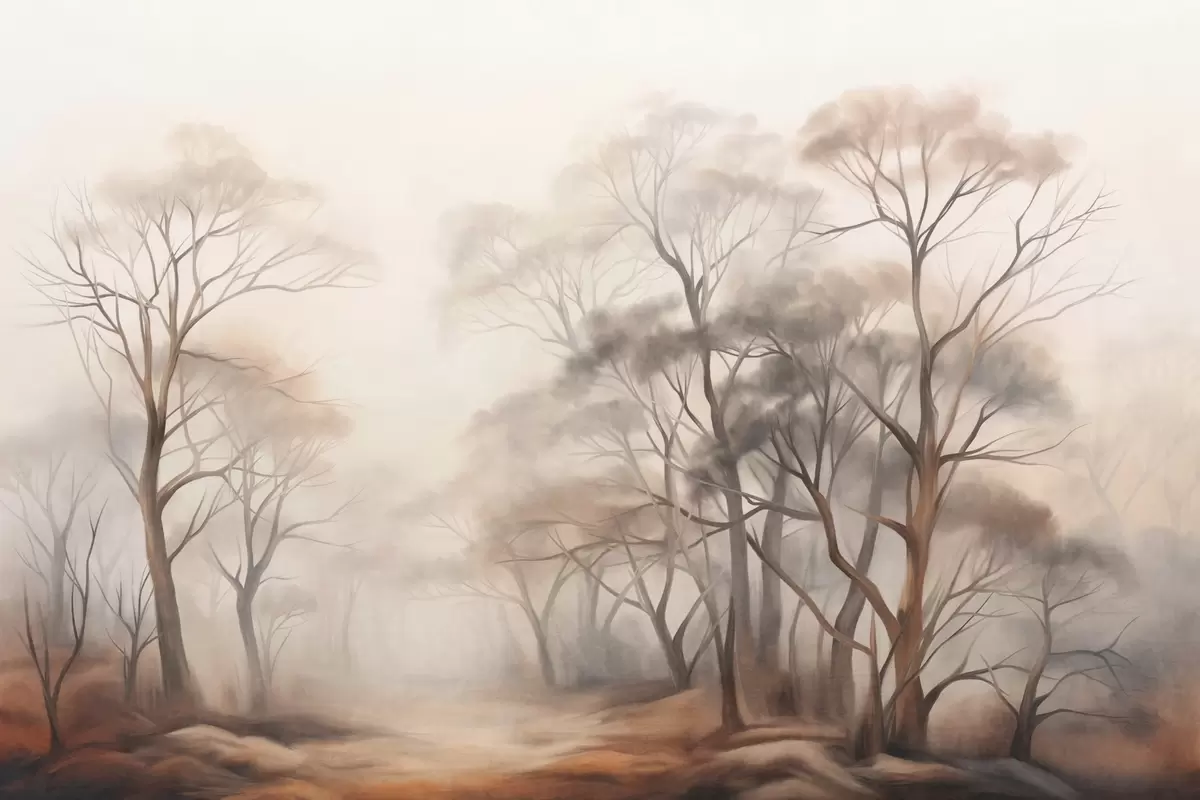 Fototapety Texturované stromy v zamlženém lese, mlhavá krajina s tlumenými barvami a jemným osvětlením Č. w09609