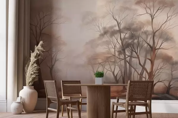 Fototapety Texturované stromy v zamlženém lese, mlhavá krajina s tlumenými barvami a jemným osvětlením Č. w09609