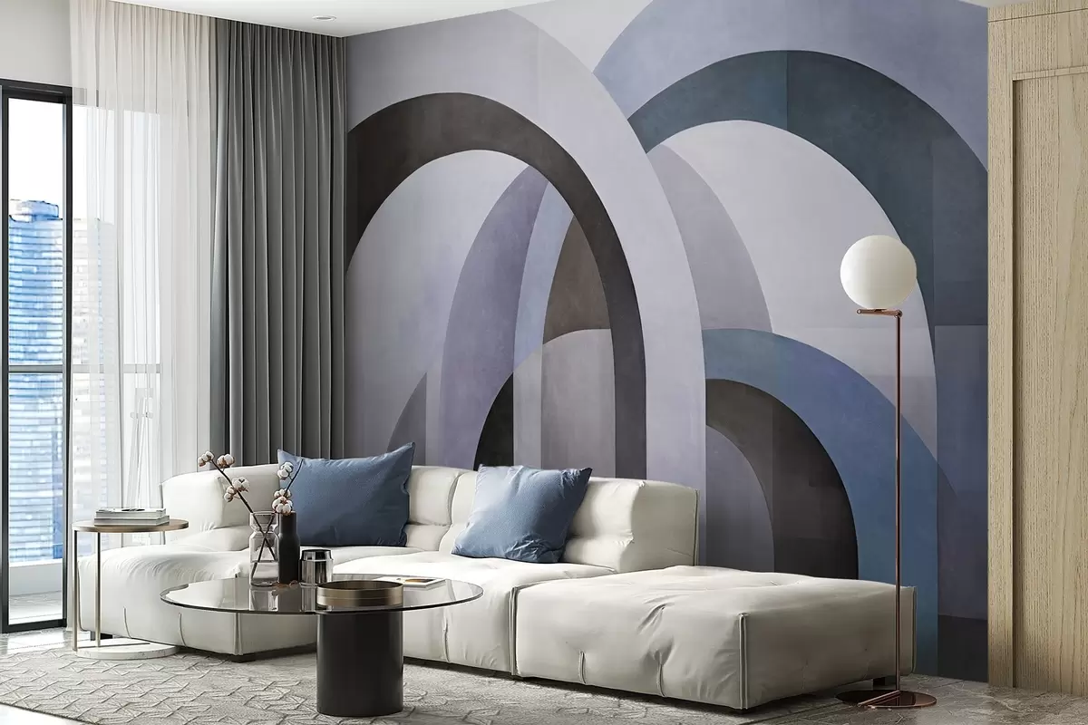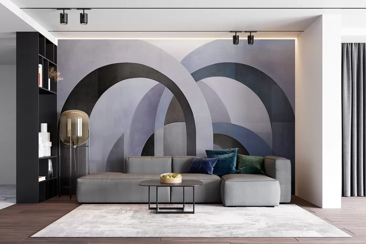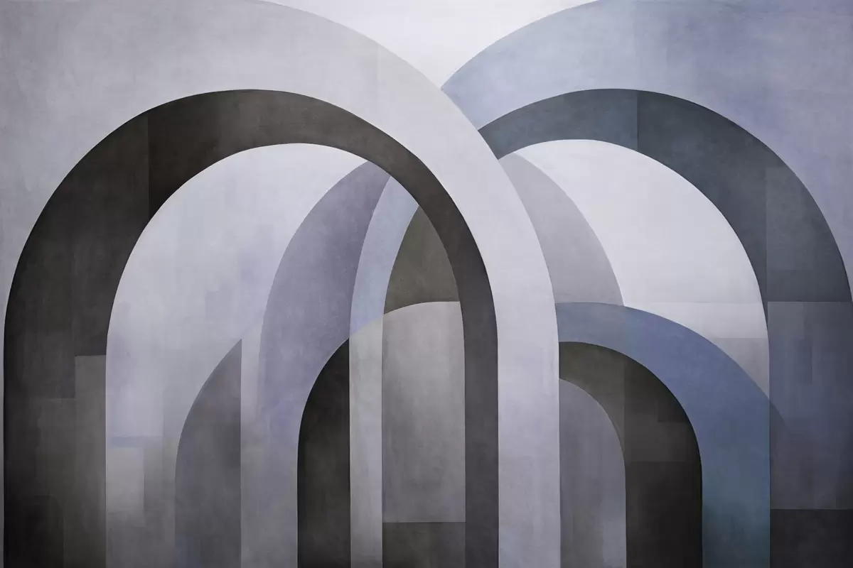 Fototapety Abstraktní texturované geometrické oblouky v odstínech modré, černé a šedé, vrstvený moderní architektonický design Č. w09611v1