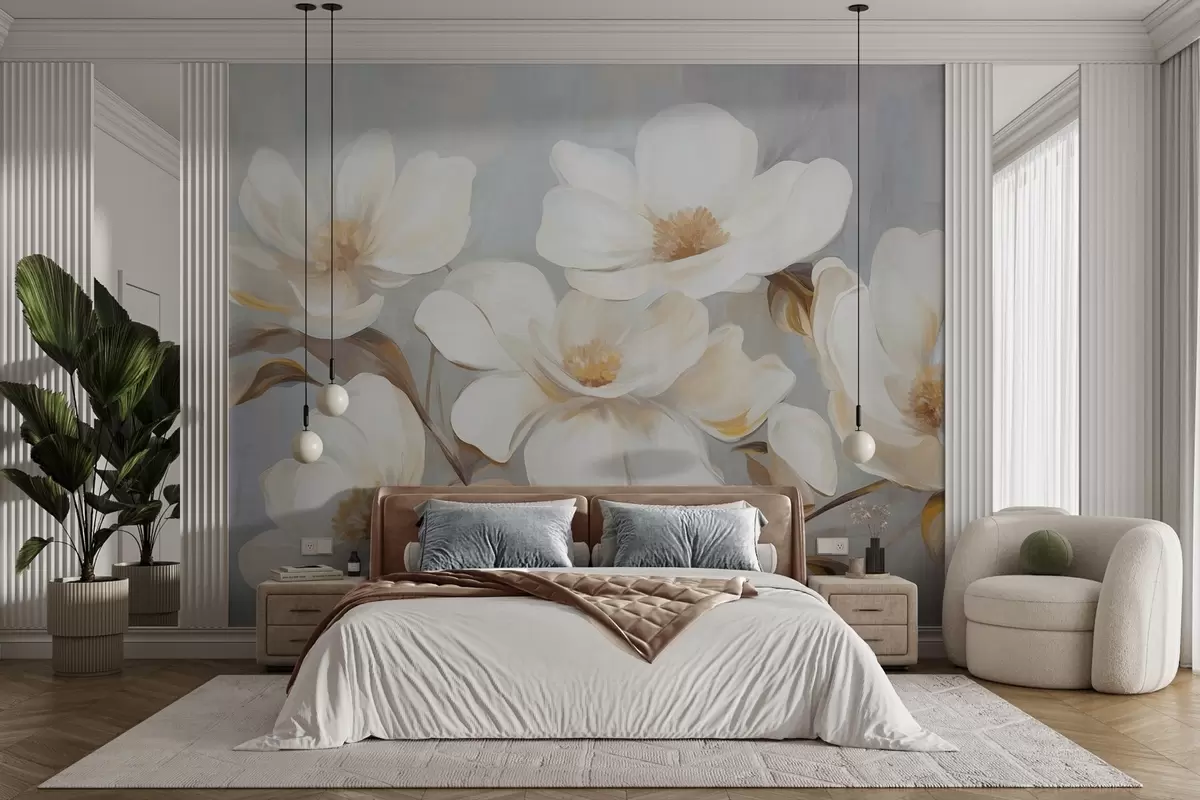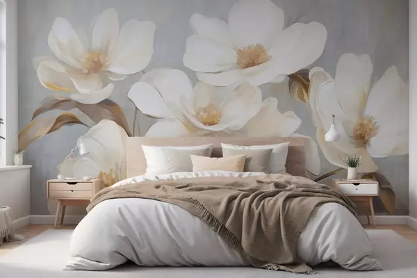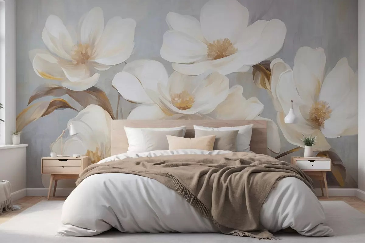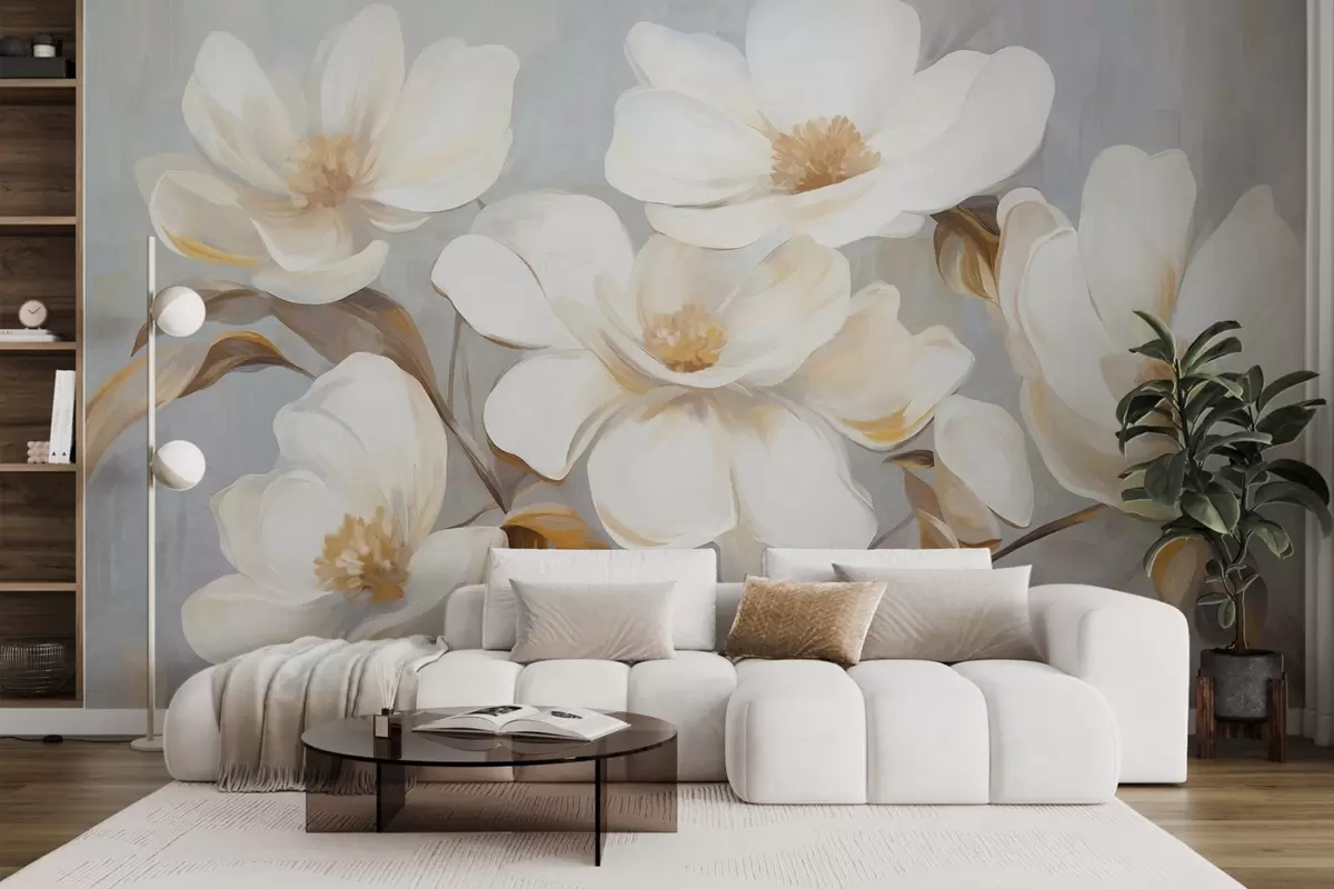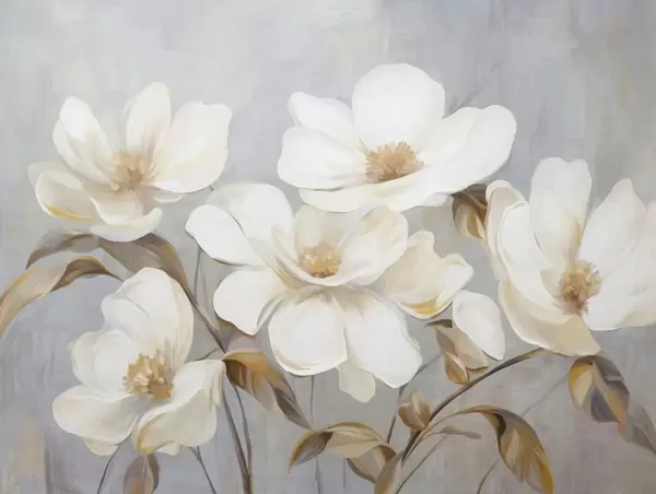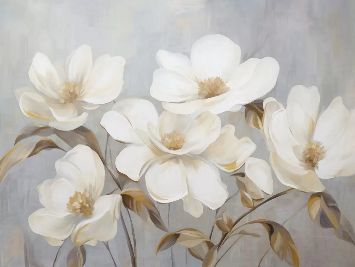Fototapety Texturovaná malba imitující několik bílých květů magnólie na tlumeném pastelovém pozadí. Č. w09612