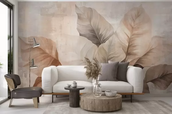 Fototapety Texturovaná malba imitující velké, světle hnědé listy na neutrálním pozadí s jemnými tahy štětcem. Č. w09614