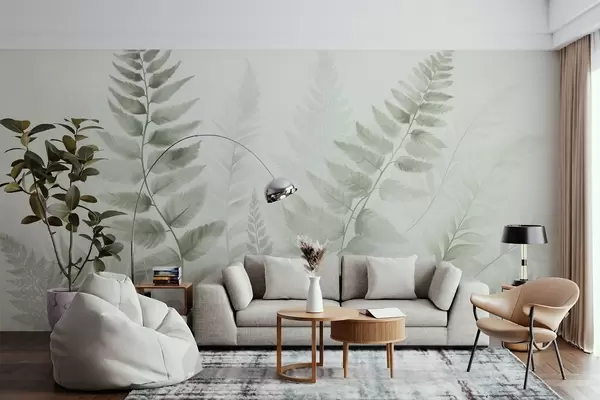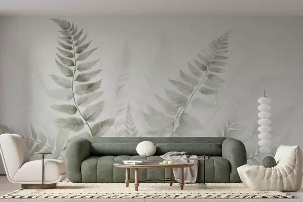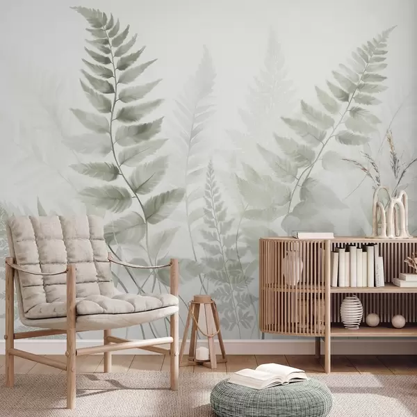 Fototapety Texturované sušené kapradinové listy v různých odstínech zelené barvy, s jemným, světlým pozadím ve stylu akvarelu. Č. w09615v1