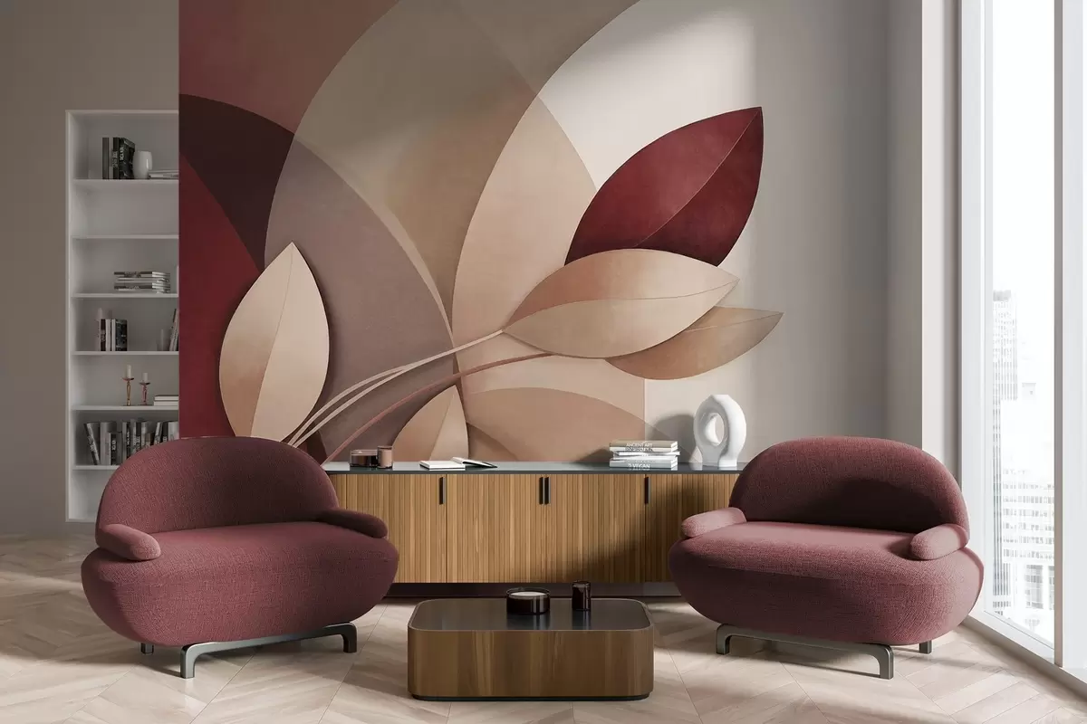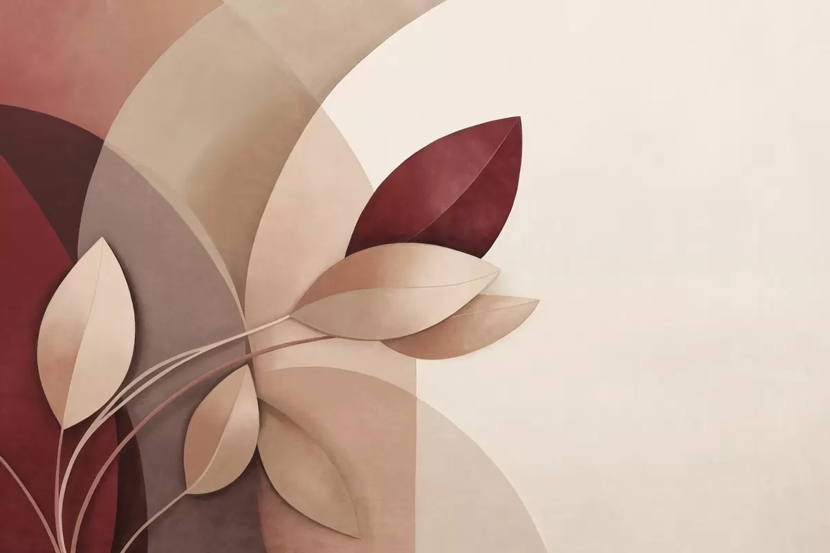 Fototapety Abstraktní texturovaná větev s listy v odstínech hnědé, béžové a červené barvy na pozadí abstraktních tvarů Č. w09618