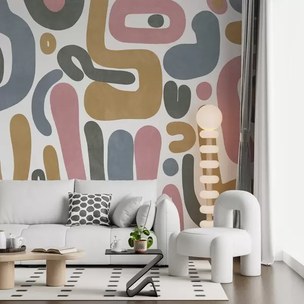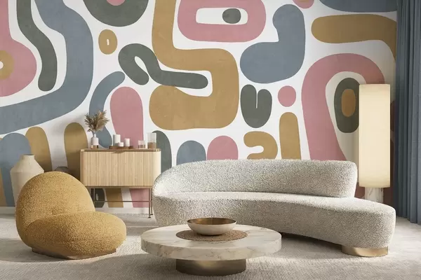 Fototapety Abstraktní texturované tvary v pastelově růžové, tlumeně modré, hořčičně žluté a šedé barvě na bílém pozadí moderní umění Č. w09620
