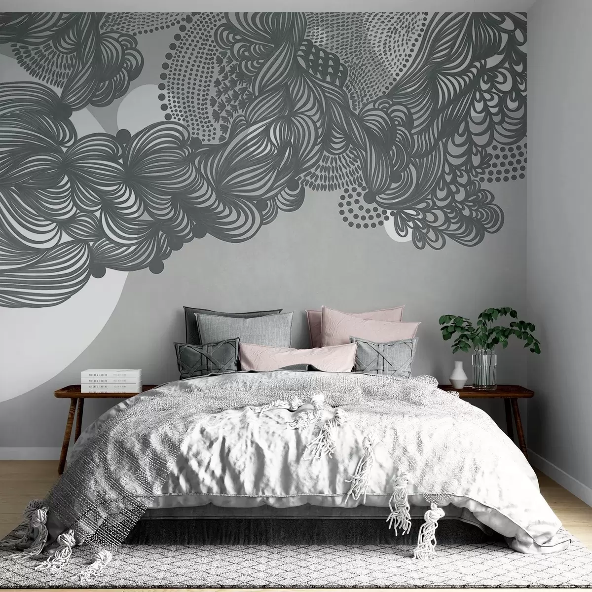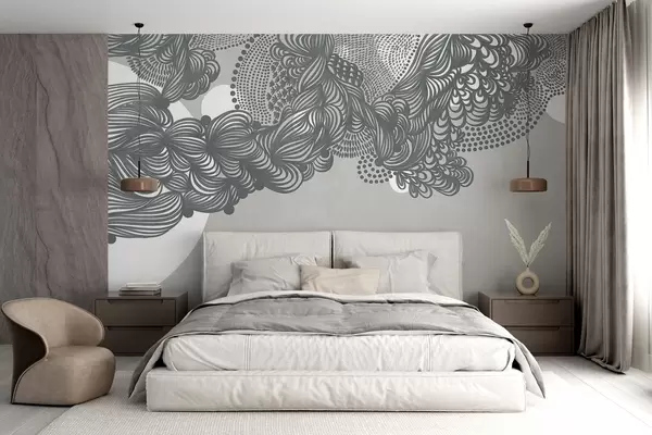 Fototapety Abstraktní texturovaný design na šedém pozadí s komplikovanými liniemi a tečkovanou texturou. Č. w09621v1