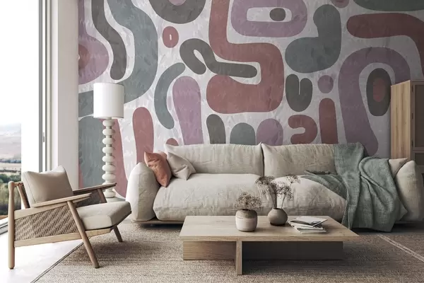 Fototapety Abstraktní tvarované tvary v tlumených růžových, zelených a šedých tónech na strukturovaném pozadí moderního umění Č. w09622