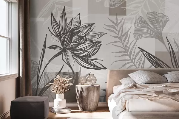 Fototapety Texturované stylizované květiny a listy v odstínech hnědé a béžové barvy, s geometrickým pozadím, kresba Č. w09629