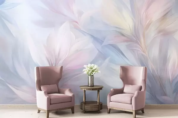 Fototapety Měkké, pastelově zbarvené listy a peří v odstínech růžové, modré a žluté, abstraktní a strukturovaný potisk Č. w09634