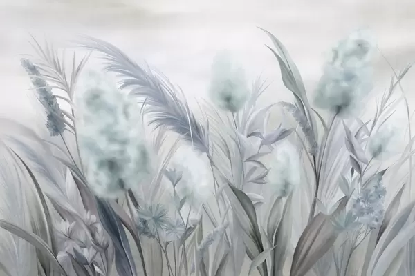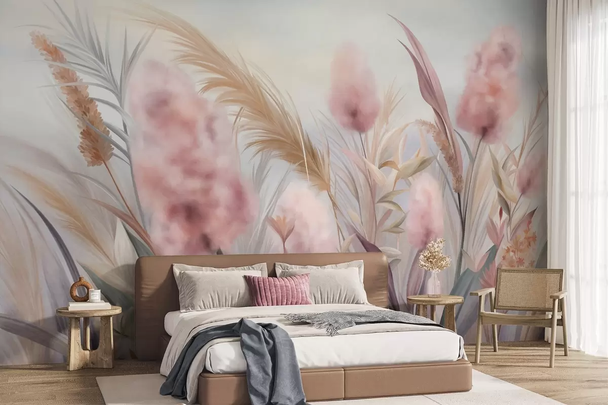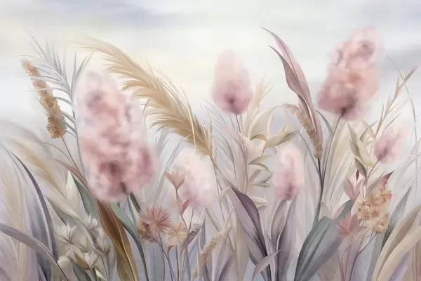 Fototapety Růžová a béžová pampová tráva a další sušené květiny s jemnou, zamlženou oblohou v pozadí Č. w09635