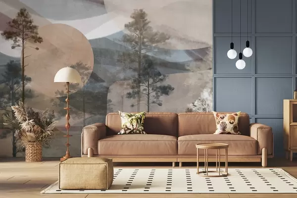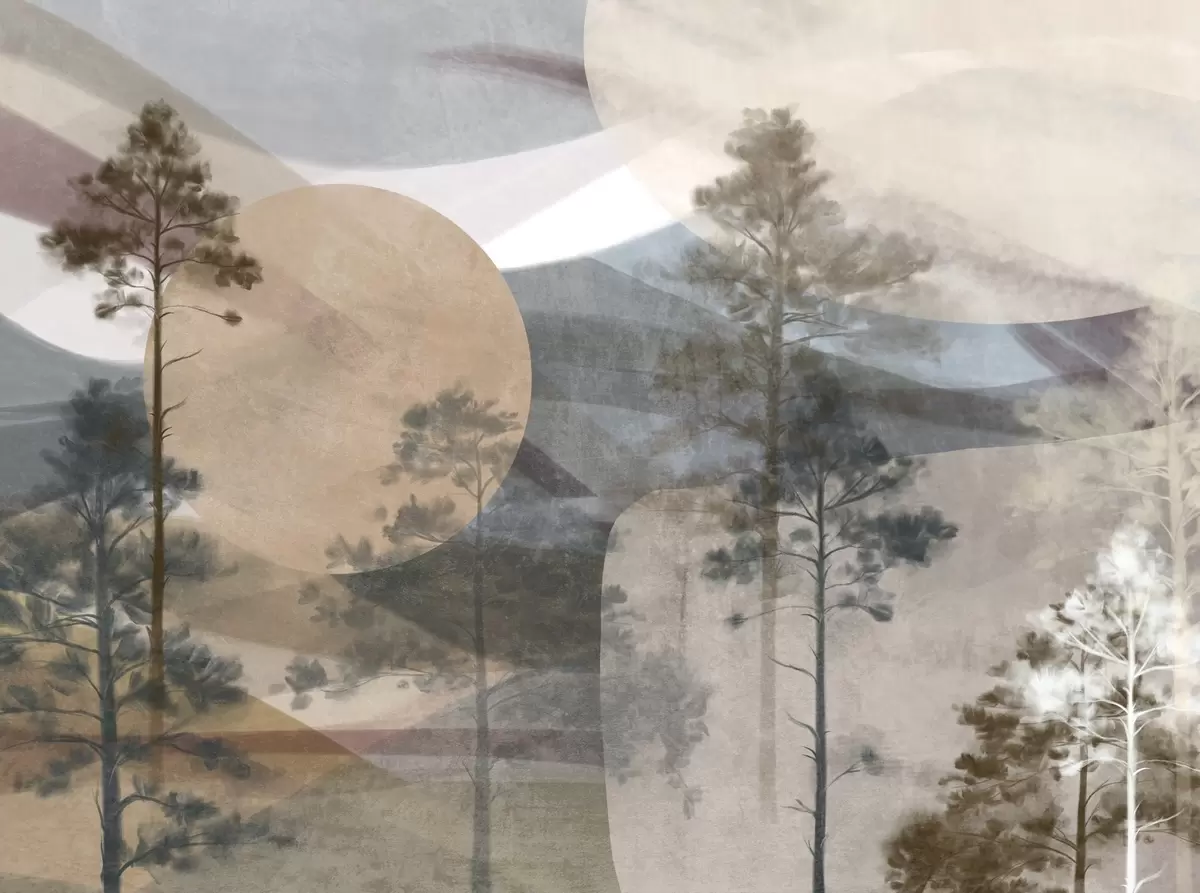 Fototapety Vysoké borovice v tlumené texturované krajině s abstraktními kruhovými tvary a vrstvenými horami v zemitých tónech Č. w09636